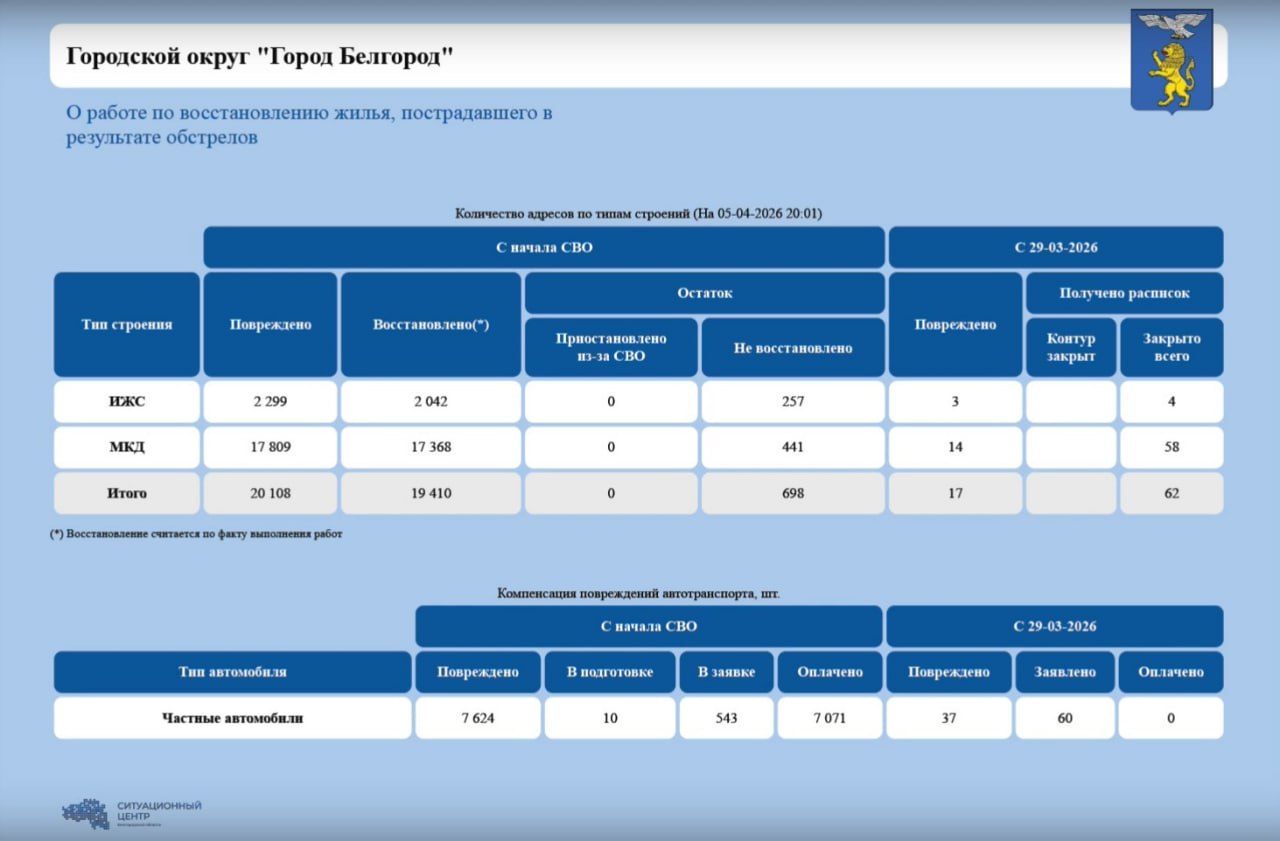За прошедшую неделю в Белгороде повреждены 37 автомобилей. Проведена экспертиза и переданы документы для выплаты компенсаций по 60 машинам. В работе остаётся 10 транспортных средств.