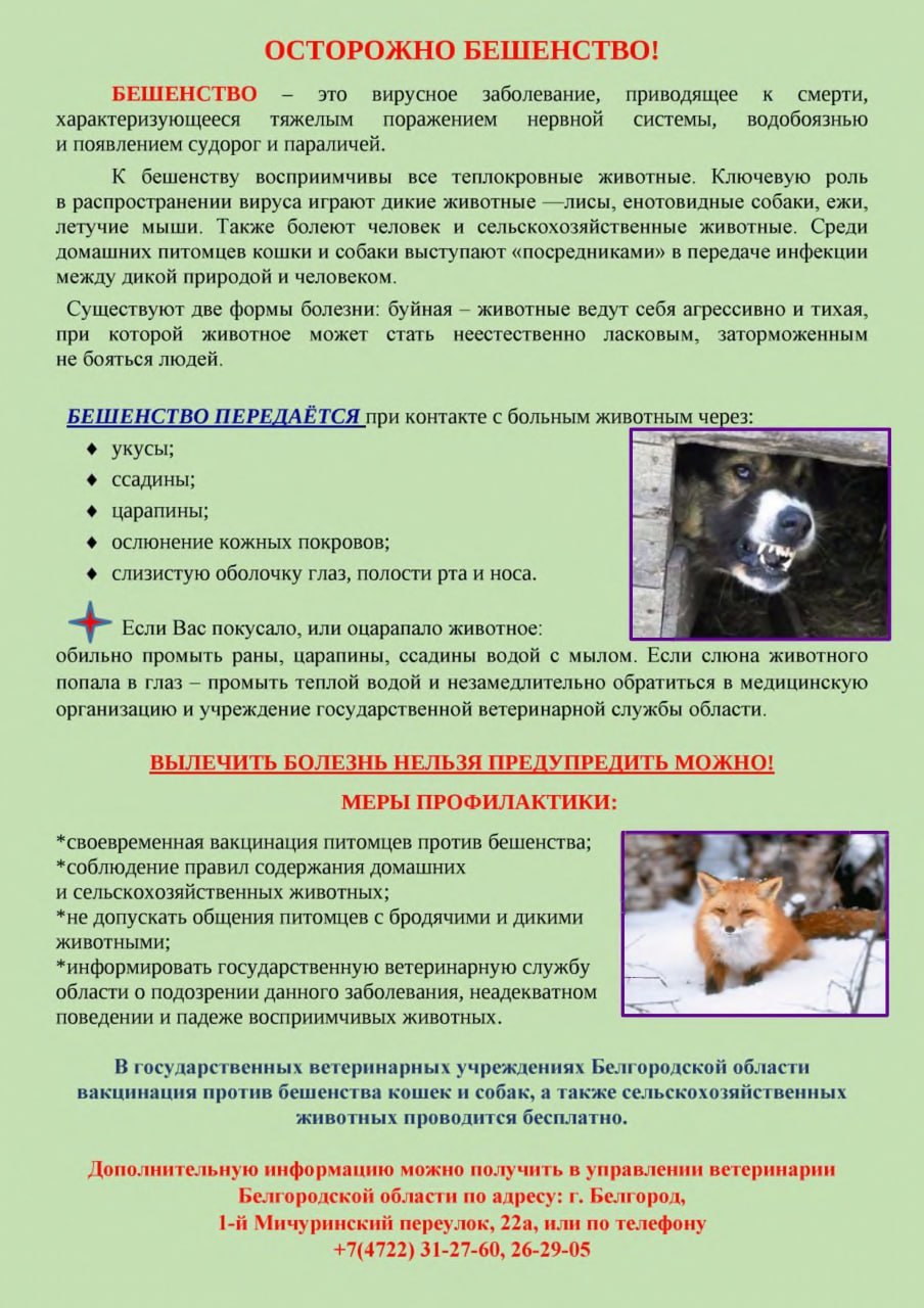Главное правило: ежегодная вакцинация питомцев. В Белгородской области привить животное от бешенства можно БЕСПЛАТНО.