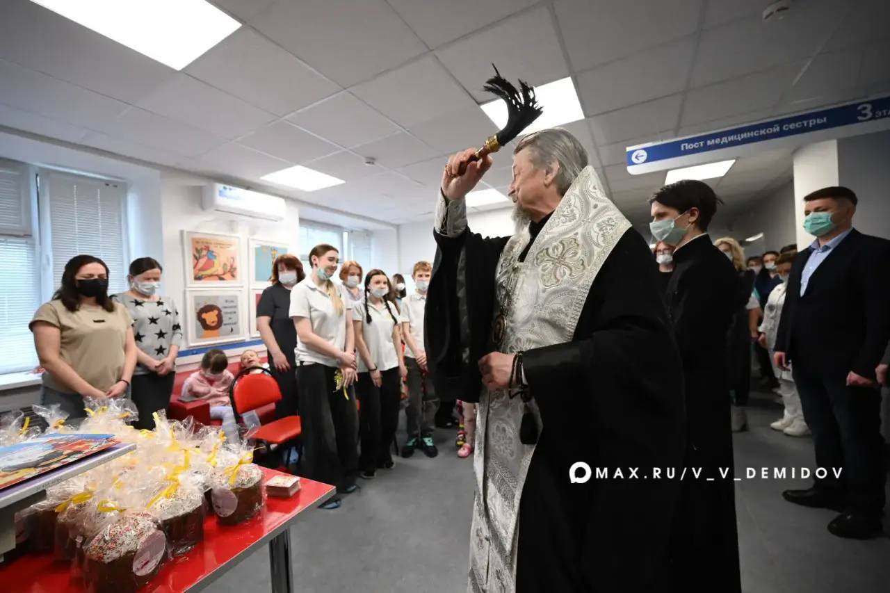 Проведать маленьких пациентов онкогематологического отделения детской больницы приехали мэр Белгорода Валентин Демидов, митрополит Белгородский и Старооскольский Иоанн, министр здравоохранения региона Андрей Иконников.