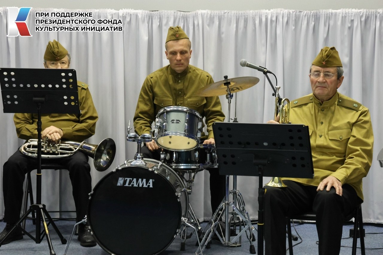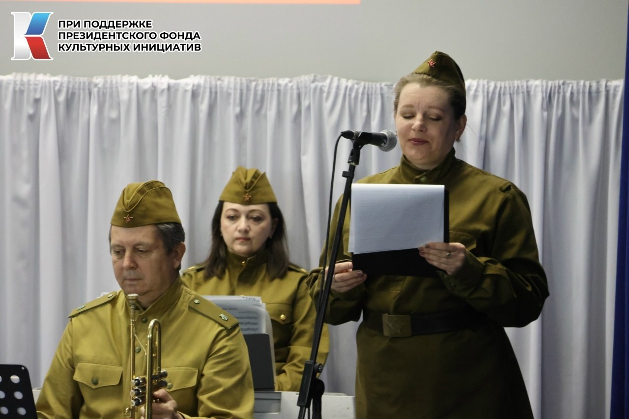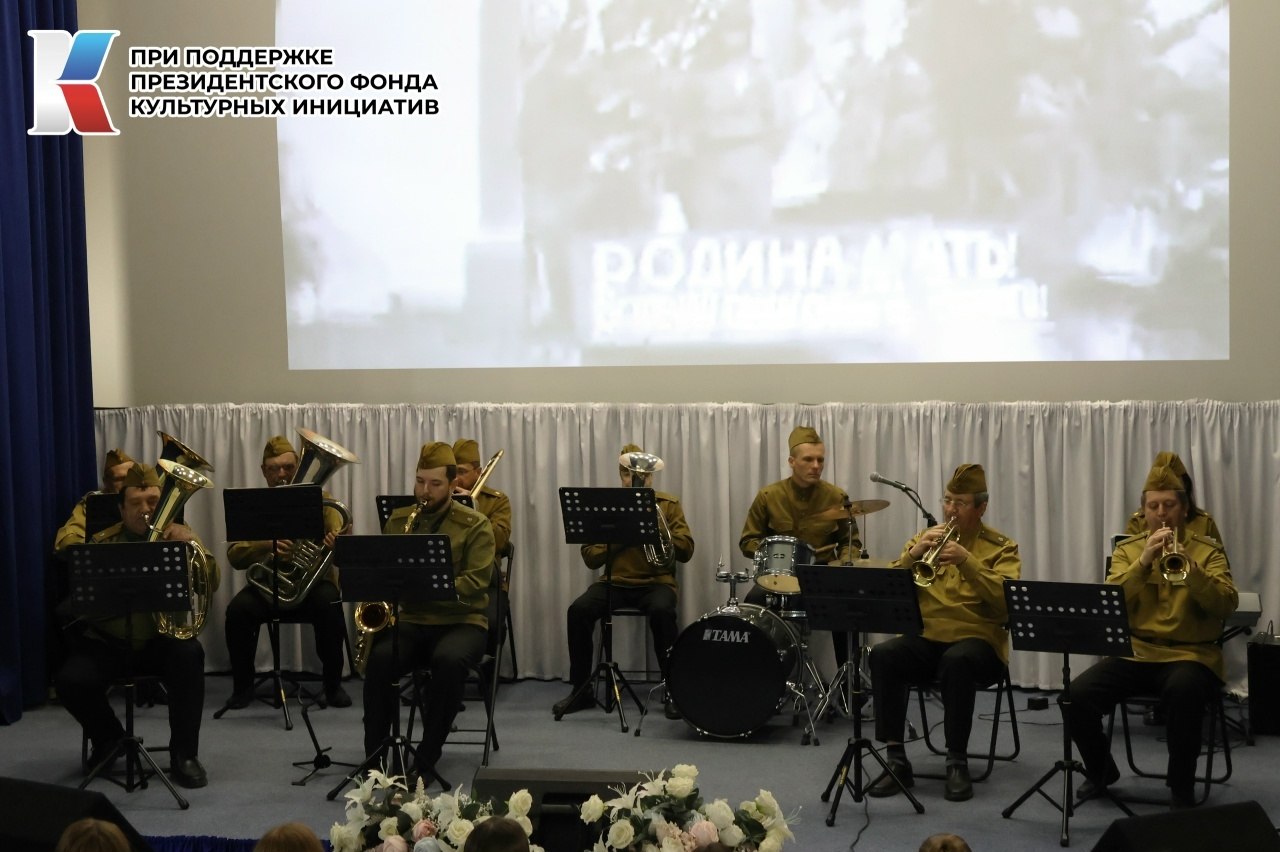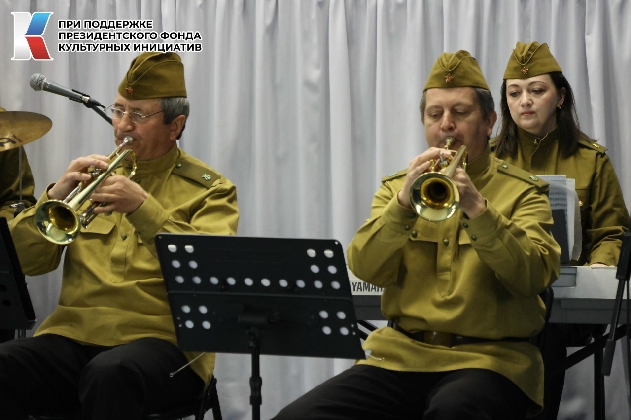 Трогательные исполнения песен-юбиляров прозвучали в исполнении народного самодеятельного коллектива – духового оркестра Грайворонского культурно-досугового центра. Живое звучание инструментов добавило музыке особой глубины и торжественности, погружая зрителей в атмосферу фронтовых лет и послевоенной радости.