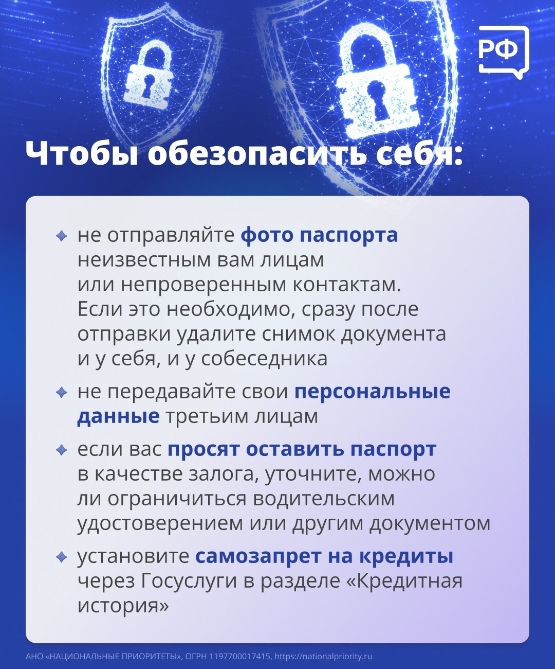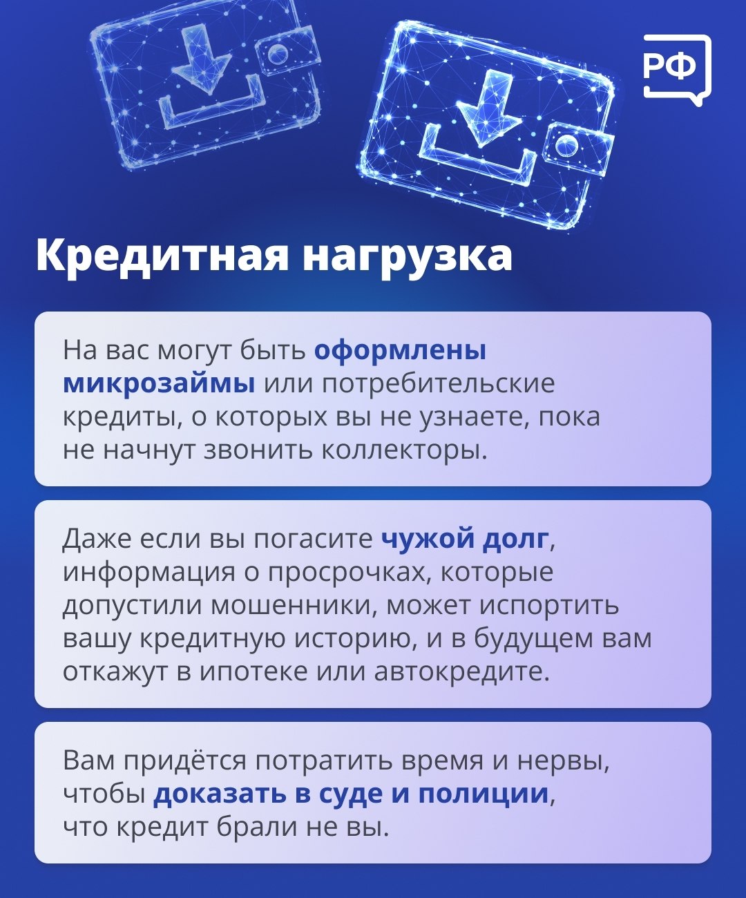 Мошенники могут воспользоваться вашими личными данными и оформить на вас кредит или заём в микрофинансовой организации.