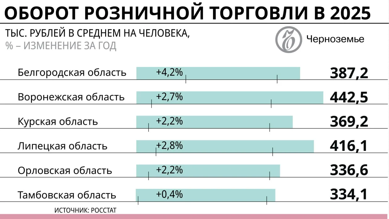 В 2025 году розничная торговля выросла во всех областях Черноземья в среднем на 2%, следует из данных Росстата. Наиболее заметная динамика в Белгородской области, где рост составил 4,2%, но по объемам лидирует Воронежская область — более 1 трлн руб. и третье место в ЦФО. Рынок платных услуг в макрорегионе тоже увеличился, больше всего также на Белгородчине. В Воронежской области показатель, напротив, снизился на 1,4%.