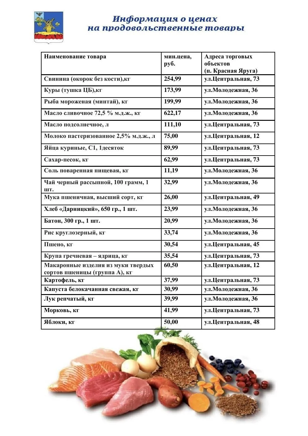 Публикую актуальную информацию о ценах на основные продукты питания на продовольственном рынке нашего района. В таблице указаны минимальные розничные цены, зафиксированные на хлеб, сахар, молоко, муку, растительное масло, масло сливочное, мясо, куриные яйца, крупы, овощи и фрукты.