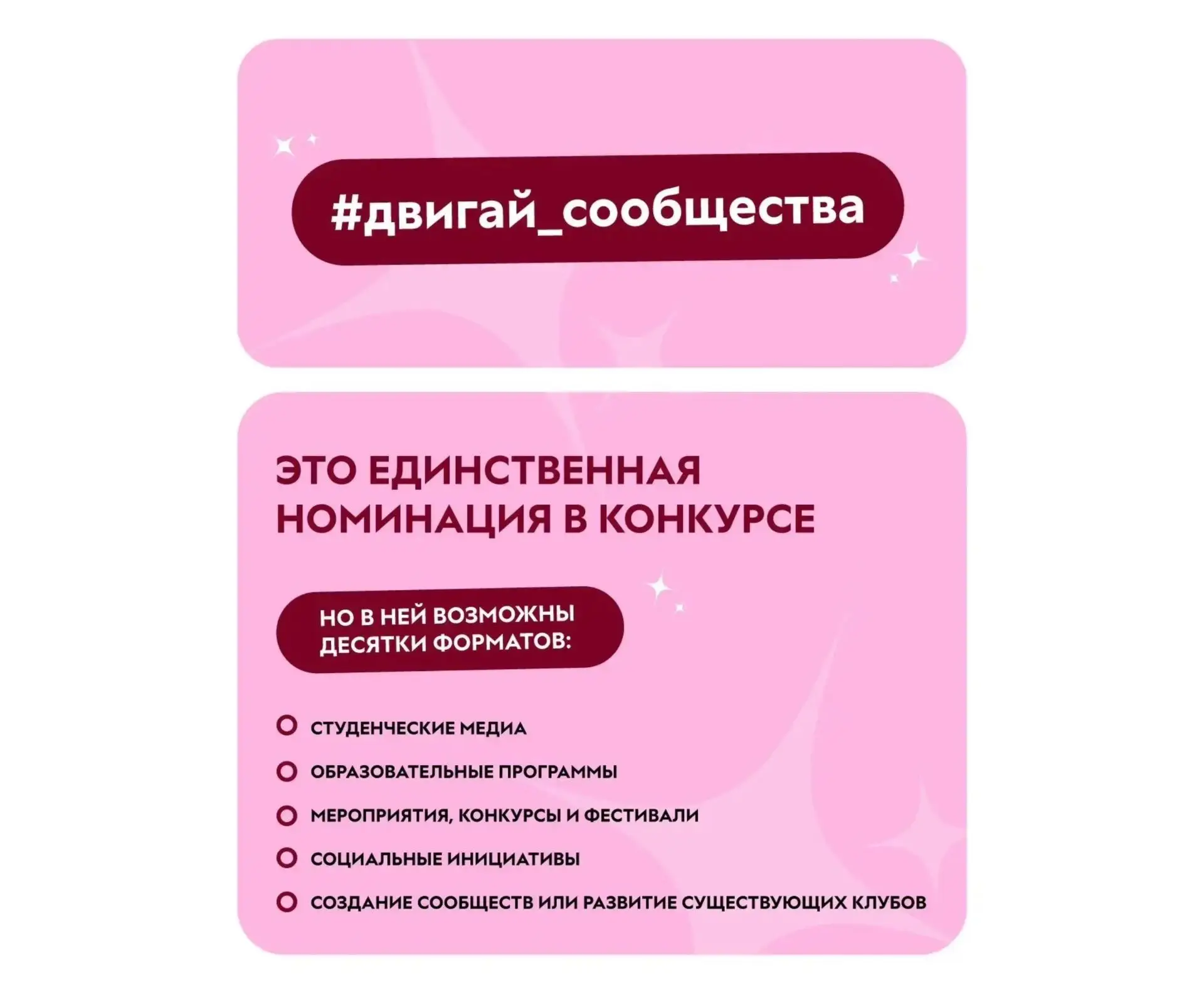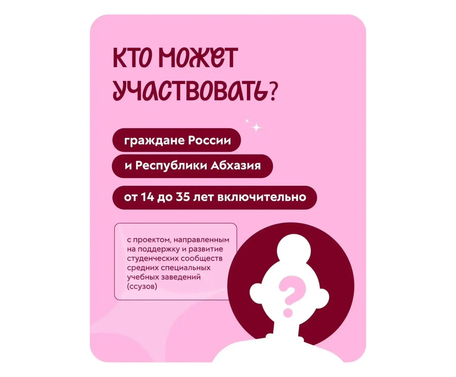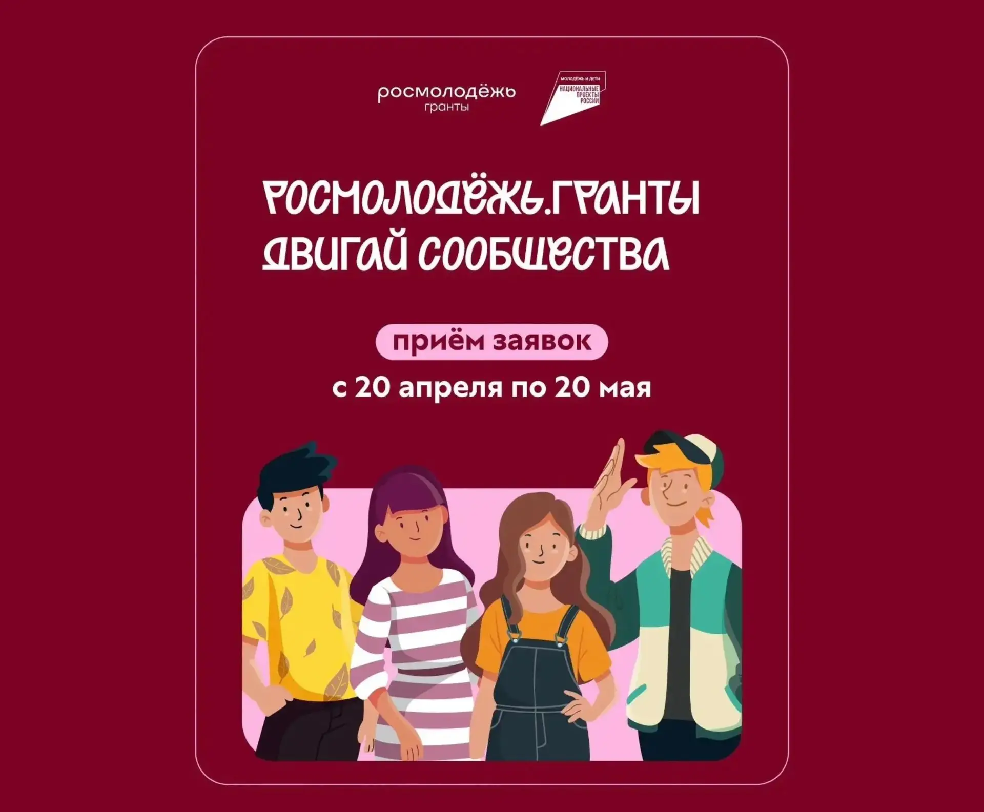 Если ты гражданин России или Республики Абхазия, тебе от 14 до 35 лет и ты хочешь реализовать проект, направленный на поддержку и развитие студенческих сообществ средних специальных учебных заведений, — у тебя есть возможность выиграть грант до 2 000 000 рублей в специальной номинации #двигай_сообщества.