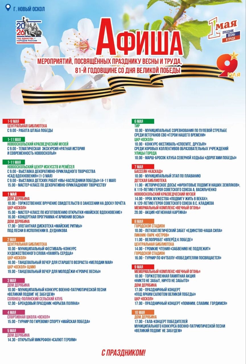 Приглашаем всех жителей и гостей Новооскольского округа на праздничные мероприятия посвящённые Дню Весны и Труда и Дню Победы!
