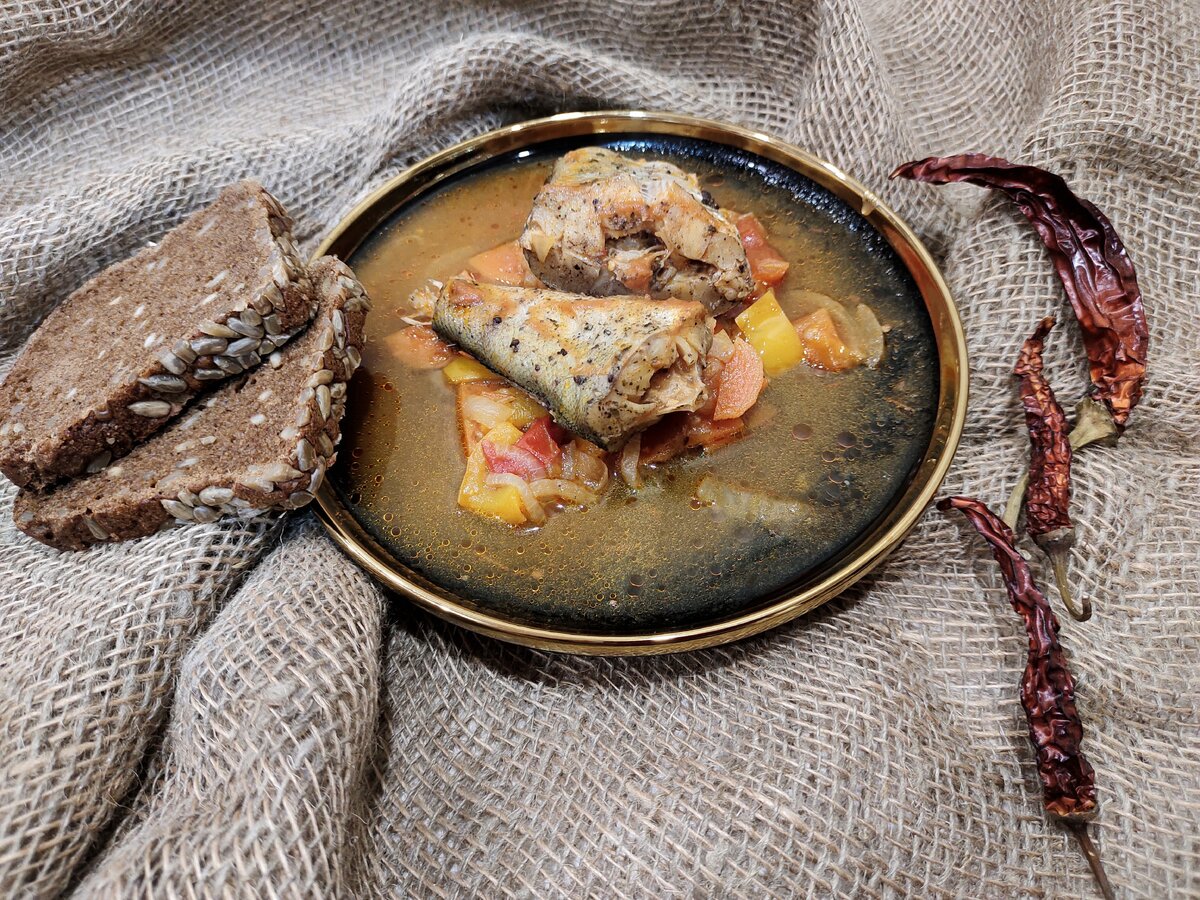 В завершении овощи заливаются кетчупом, добавляется горячая вода и лавровый лист. Всё перемешивается, приправляется по вкусу, и можно заменить кетчуп томатной пастой, добавив немного сахара для разнообразия. На овощи аккуратно выкладываются кусочки рыбы, после чего сковорода накрывается крышкой и тушится в течение 30 минут.
