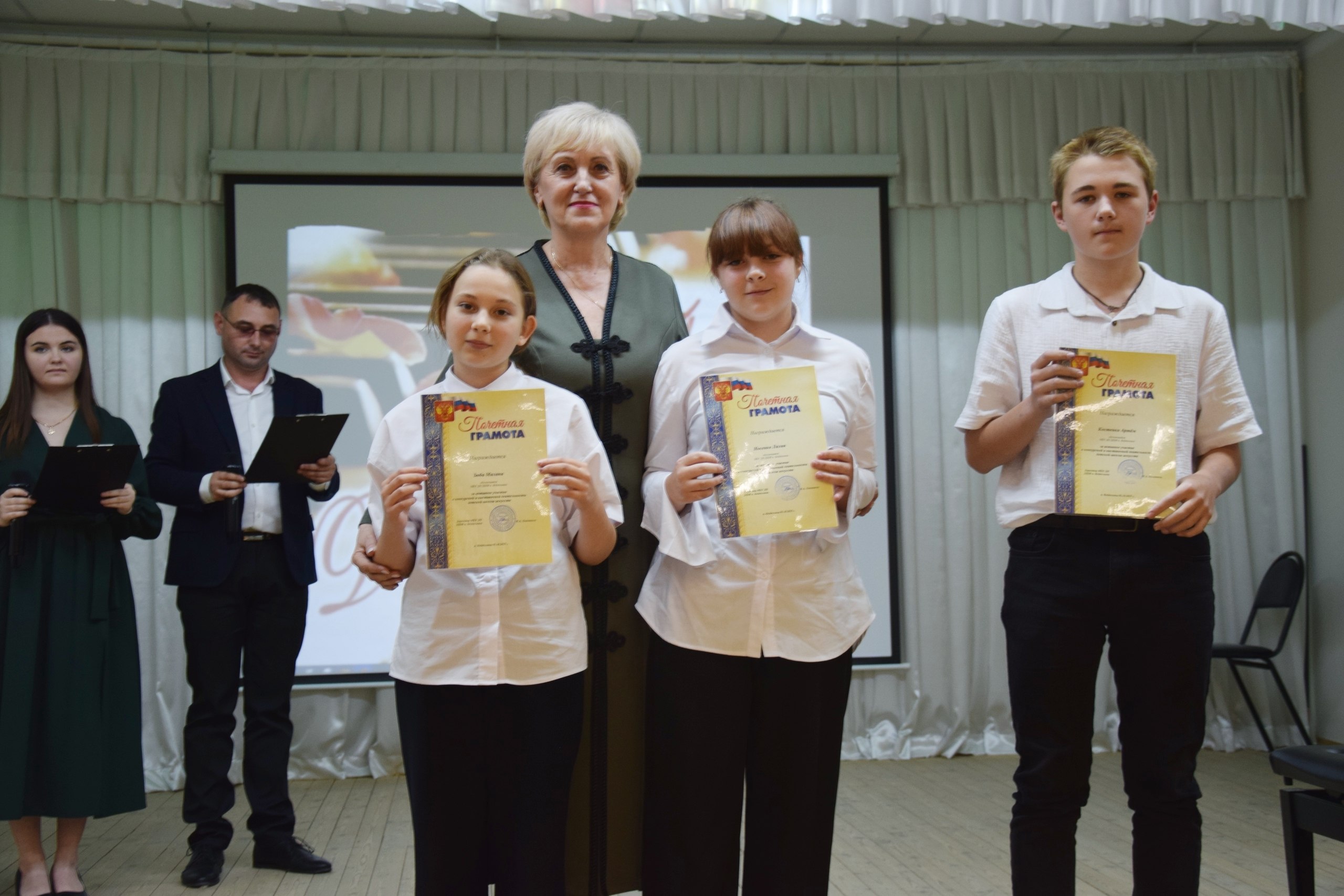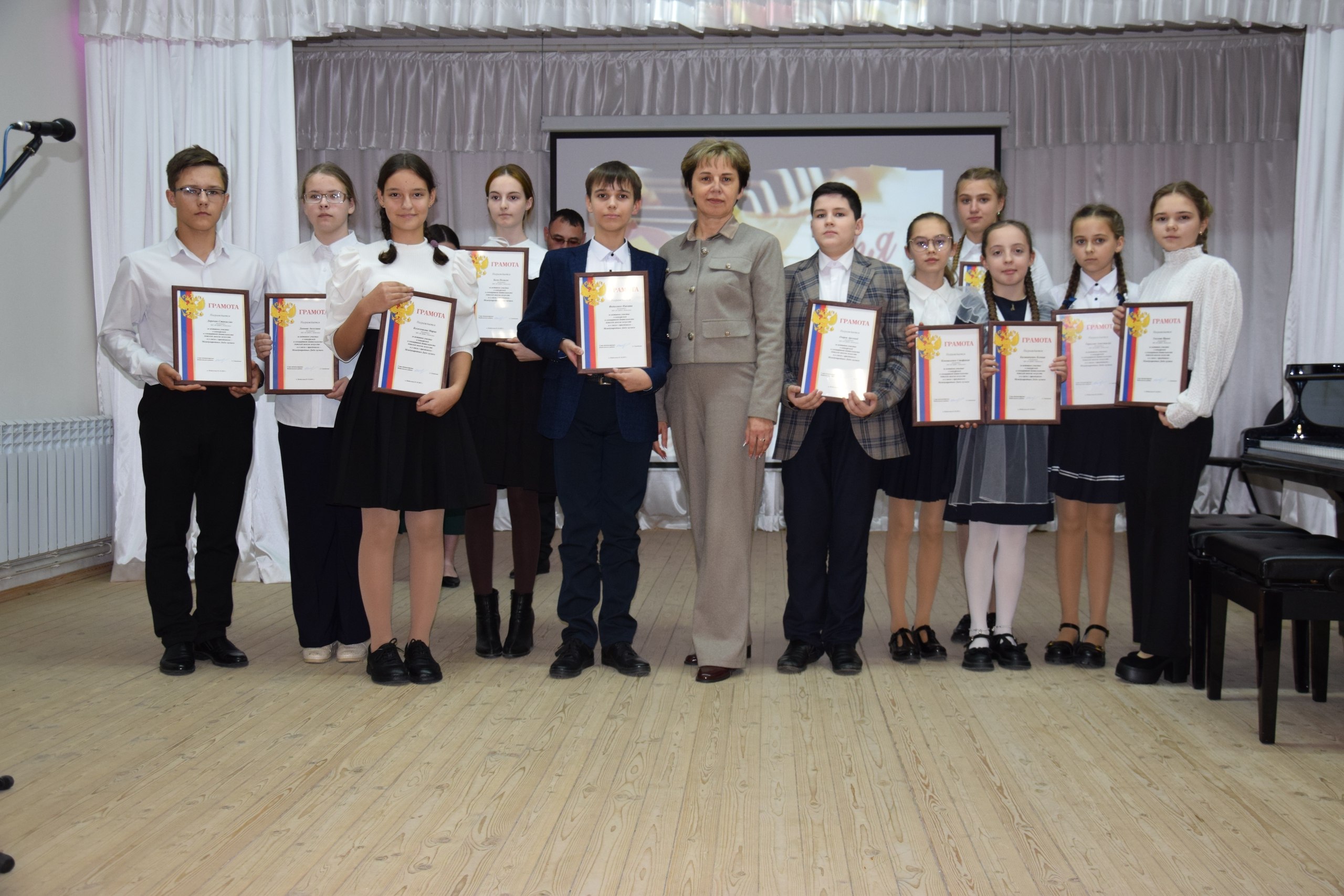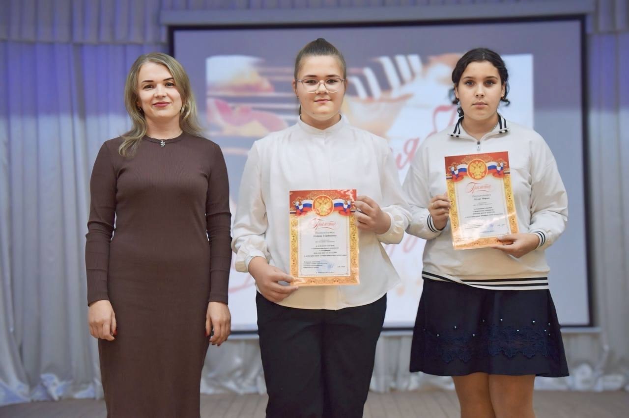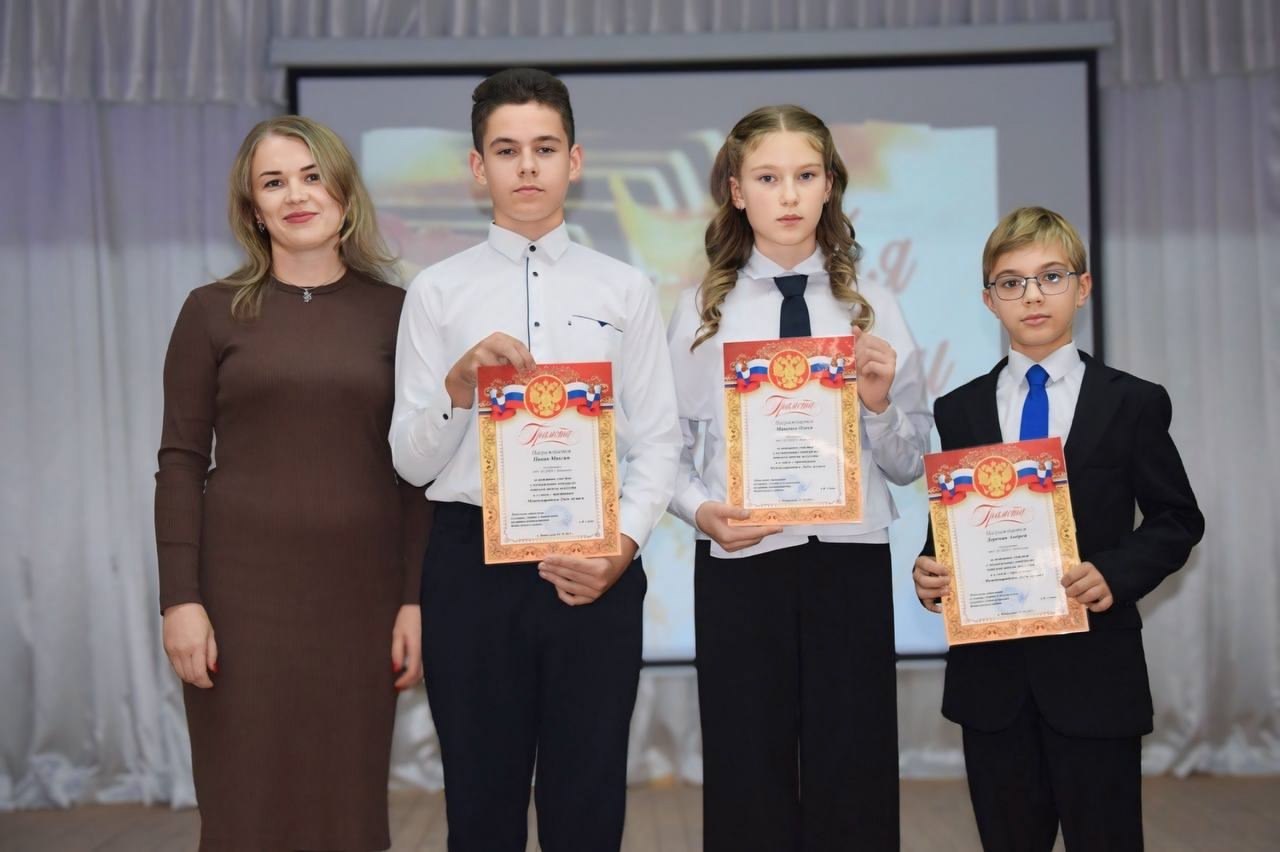 Глава администрации района Анжелика Самойлова, заместитель начальника культуры Ирина Короткова и директор школы искусств Наталья Лепетюха вручили заслуженные награды нашим юным дарованиям. А они, в свою очередь, создали праздничное настроение замечательными номерами.
