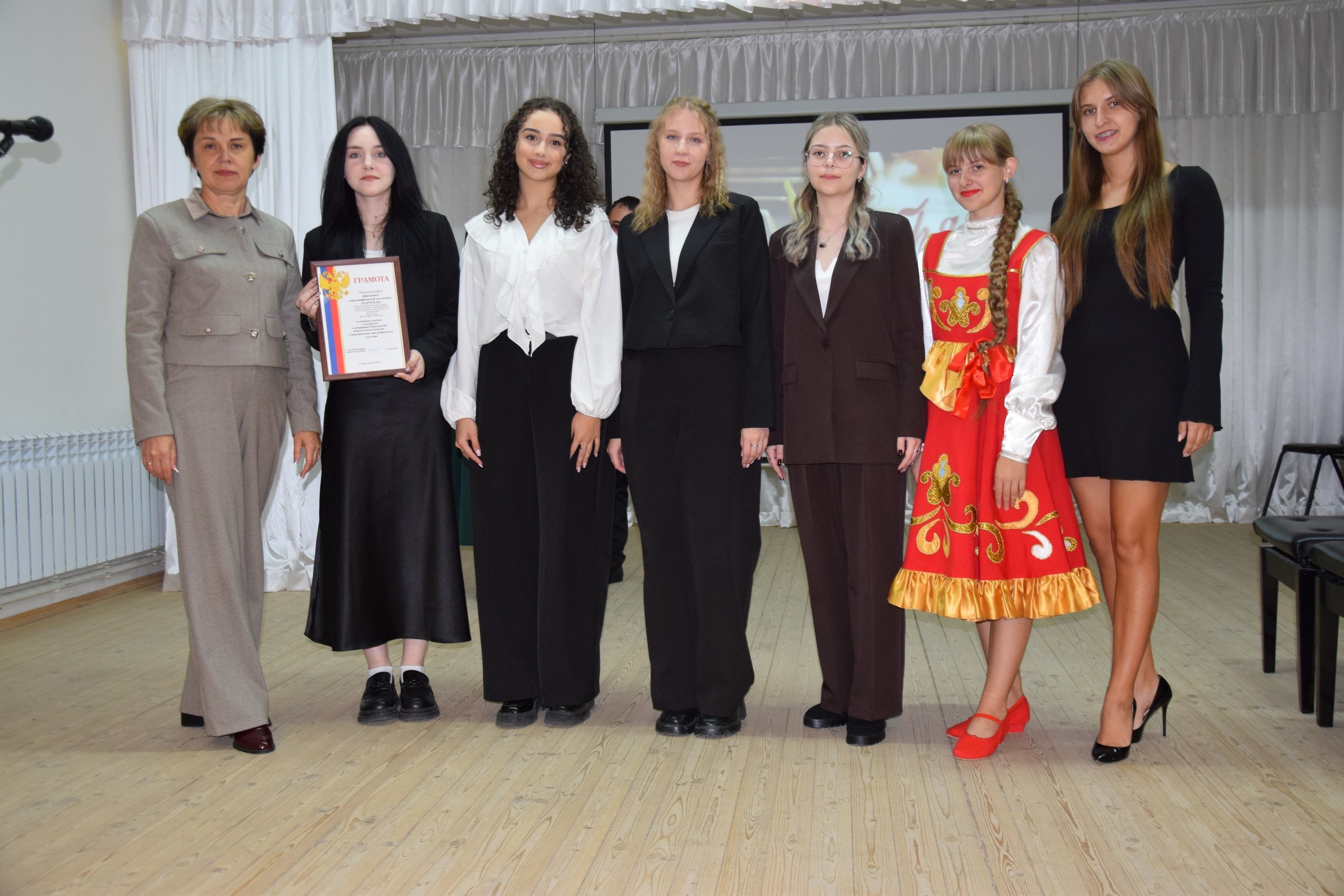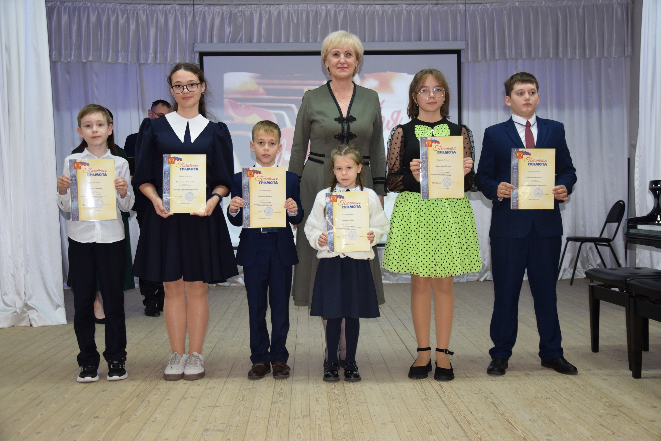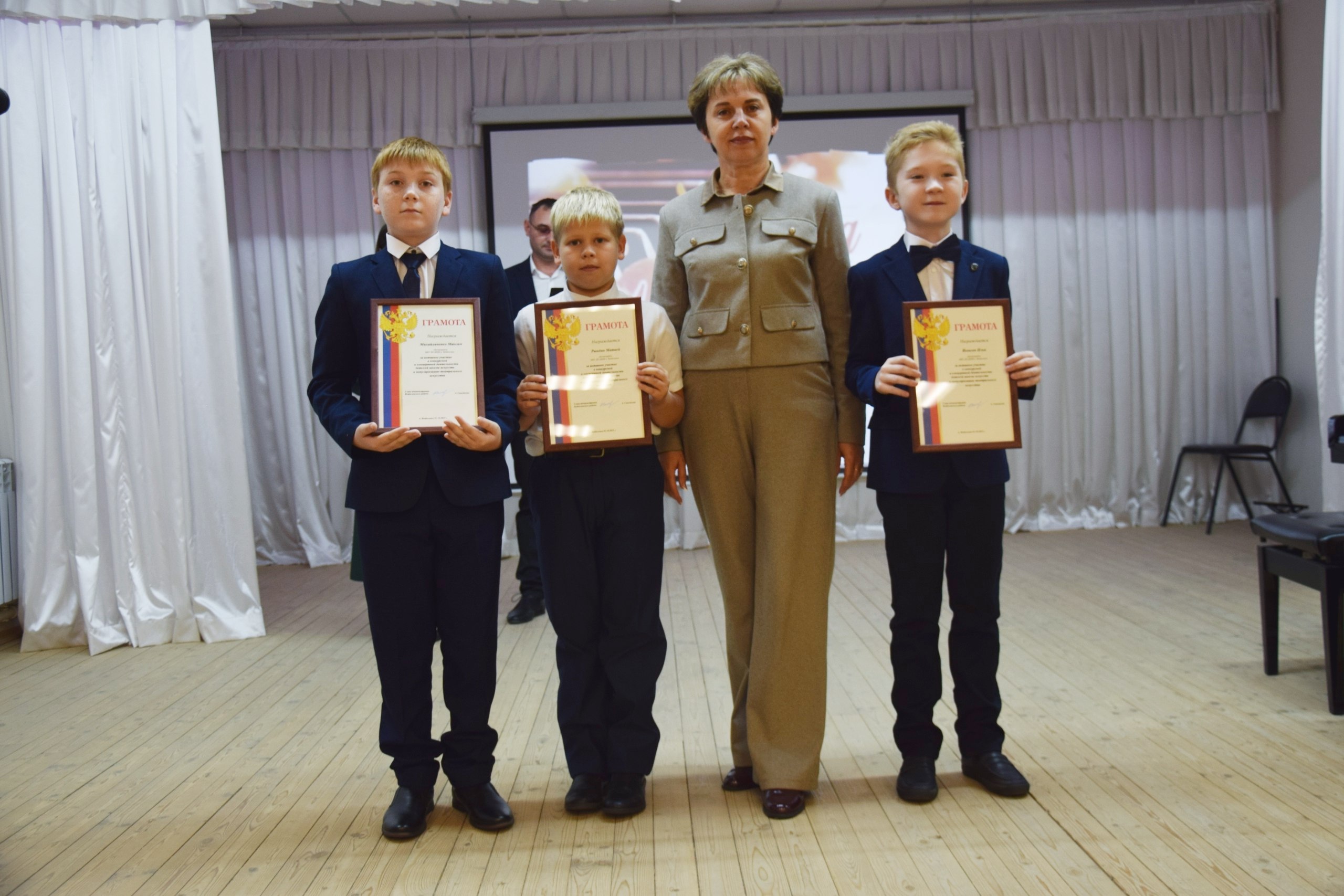 Глава администрации района Анжелика Самойлова, заместитель начальника культуры Ирина Короткова и директор школы искусств Наталья Лепетюха вручили заслуженные награды нашим юным дарованиям. А они, в свою очередь, создали праздничное настроение замечательными номерами.