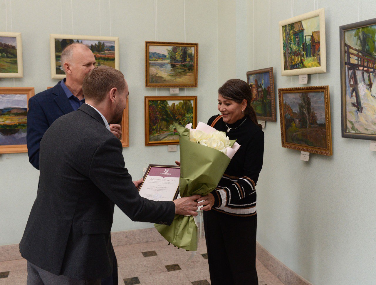 В рамках церемонии открытия вручил почётную грамоту Екатерине Севергиной, чья выставка была открыта ранее.