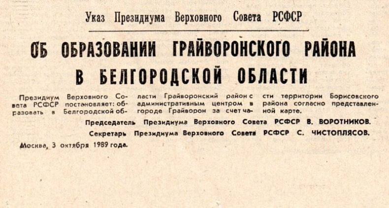 И через два месяца, 3 октября 1989 года, Председатель Президиума Верховного Совета РСФСР Виталий Воротников подписал Указ о создании Грайворонского района: «Образовать в Белгородской области Грайворонский район с административным центром в городе Грайвороне за счёт части территории Борисовского района согласно представленной карте».