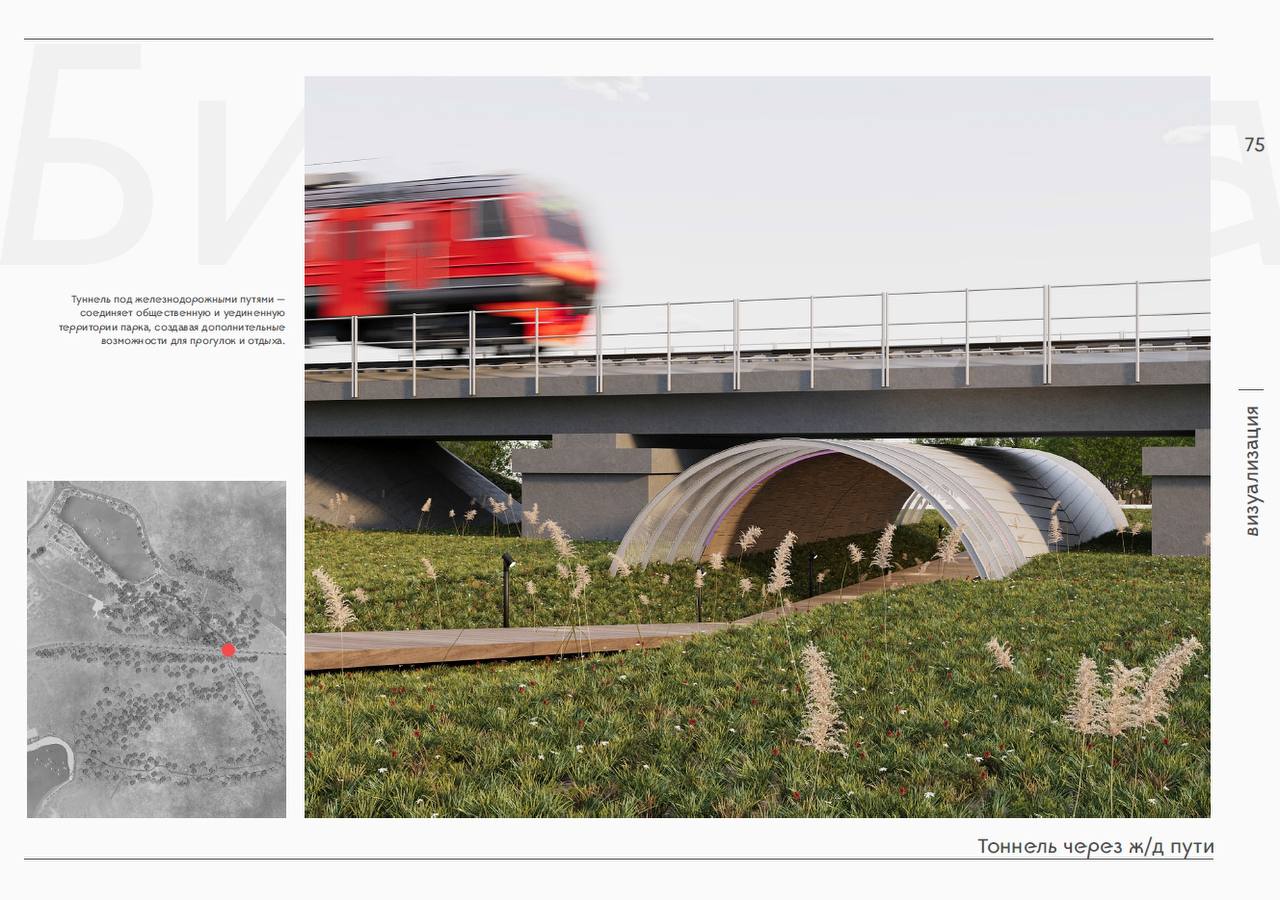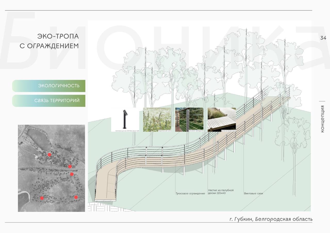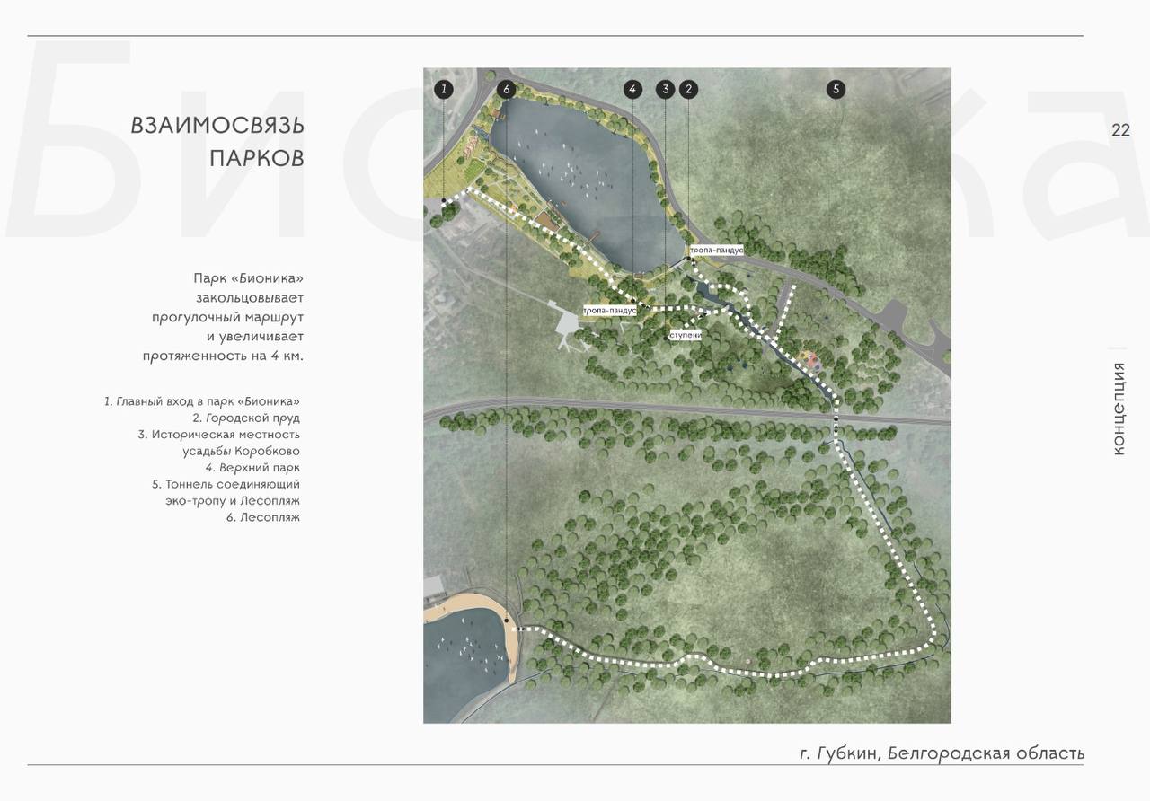 Проект «БИОНИКА» направлен на создание единой зоны комфортного пребывания жителей города, включающей природные объекты и рекреационные площадки и объединит такие общественные пространства, как долина ручья Теплый Колодезь, верхний и нижний парки, «Губкин-Лесопляж».