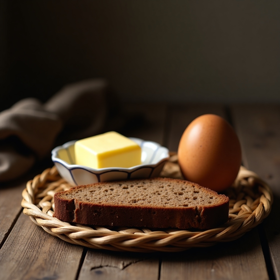 - Яйцо всмятку с ржаным хлебом и сливочным маслом, приправленным укропом и петрушкой;