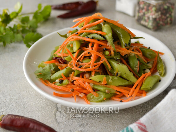 - Стручковая фасоль по-корейски: На 150 г фасоли потребуется одна морковь, куриная приправка и 4-5 зубчиков чеснока. Это блюдо готовится в среднем за 80 минут и является настоящим лакомством под водку.