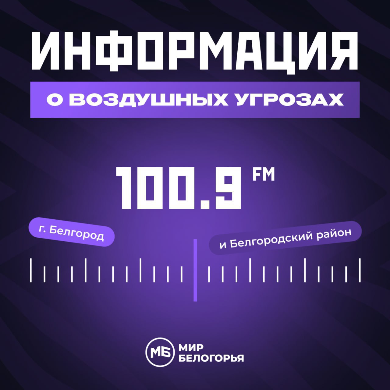 В Белгороде радио «Мир Белогорья» вещает на частоте 100,9 FM. Экстренная информация о воздушных угрозах дублируется в эфире из Телеграм-канала «Информация БПЛА Белгород, Белгородский район».