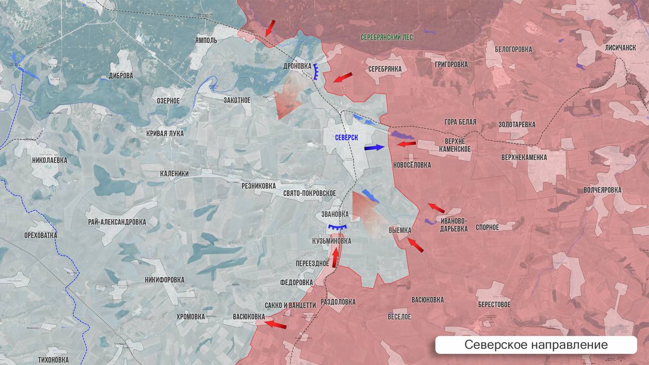 На южном фасе Северского участка российские бойцы сняли кадры с флагами в южной, западной и северной частях Фёдоровки, подтверждая данные об окончании зачистки села. Ранее Минобороны сообщало о его освобождении. ВС РФ форсировали реку Сухая Плотва у Выемки и продвигаются к Северску с юга, приближаясь к окраинам Звановки. Также наши подходят к городу и с севера — бои идут в небольшом частном секторе. Кроме того, отмечено продвижение наших войск на северо-западе и юго-востоке от Дроновки. ВСУ стягивают резервы западнее Северска, контратакуют со стороны Платоновки южнее Дроновки, пытаясь не допустить прорыва российских подразделений к трассе Красный Лиман - Закотное - Северск. У восточной окраины Северска идут позиционные бои в районе укрепрайона, прикрывающего подступы к городу. Продолжаются бои за Ямполь: ни одна из сторон не контролирует ни северную часть, ни северо-восточную. Не подтверждается информация о российском флаге на ж/д станции в городе, а также об отходе противника из Ямполя.