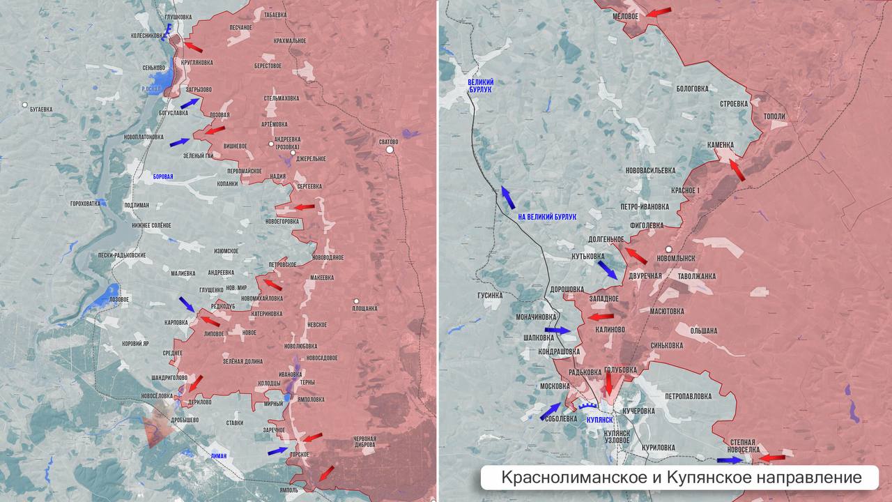На Краснолиманском фронте ВС РФ продвигаются на северо-западе от Заречного, а также бьются южнее, в районе балки. При этом ВСУ ожесточенно контратакуют из района Красного Лимана. Наши пытаются с севера пробиться по направлению к Ставкам и Дробышево. Замедлилось продвижение в центральной части Новосёловки. В Карповке, Редкодубе, южнее Глущенково, в Новомихайловском лесу продолжаются тяжёлые бои. На севере участка развивается сражение за Боровскую Андреевку.