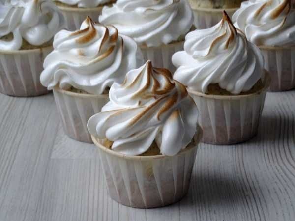 При помощи кондитерского мешка добавьте лимонный курд в серединку остывших капкейков и закройте их "крышечками". Для приготовления крема, соедините белки с сахаром и лимонным соком, слегка взбейте, а затем поставьте на водяную баню. Продолжайте взбивать до появления плотных узоров, потом отсадите крем на капкейки. По желанию, можно слегка поджарить крем с помощью газовой горелки — получится эффектно и стильно!