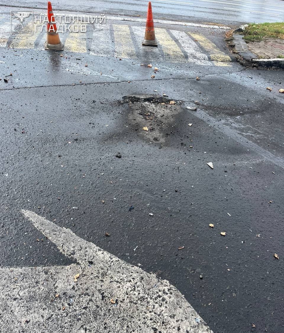От удара второго БПЛА повреждено дорожное полотно рядом с коммерческим объектом (фото 3).