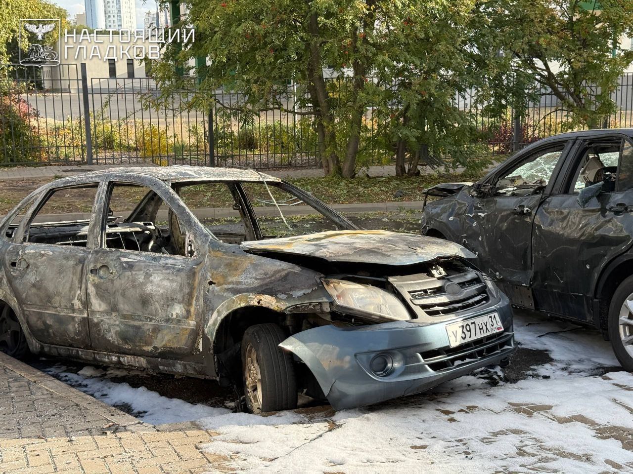 В результате детонации БПЛА загорелся автомобиль. Сотрудники МЧС ликвидировали огонь. Повреждены также два рядом стоящих автомобиля.