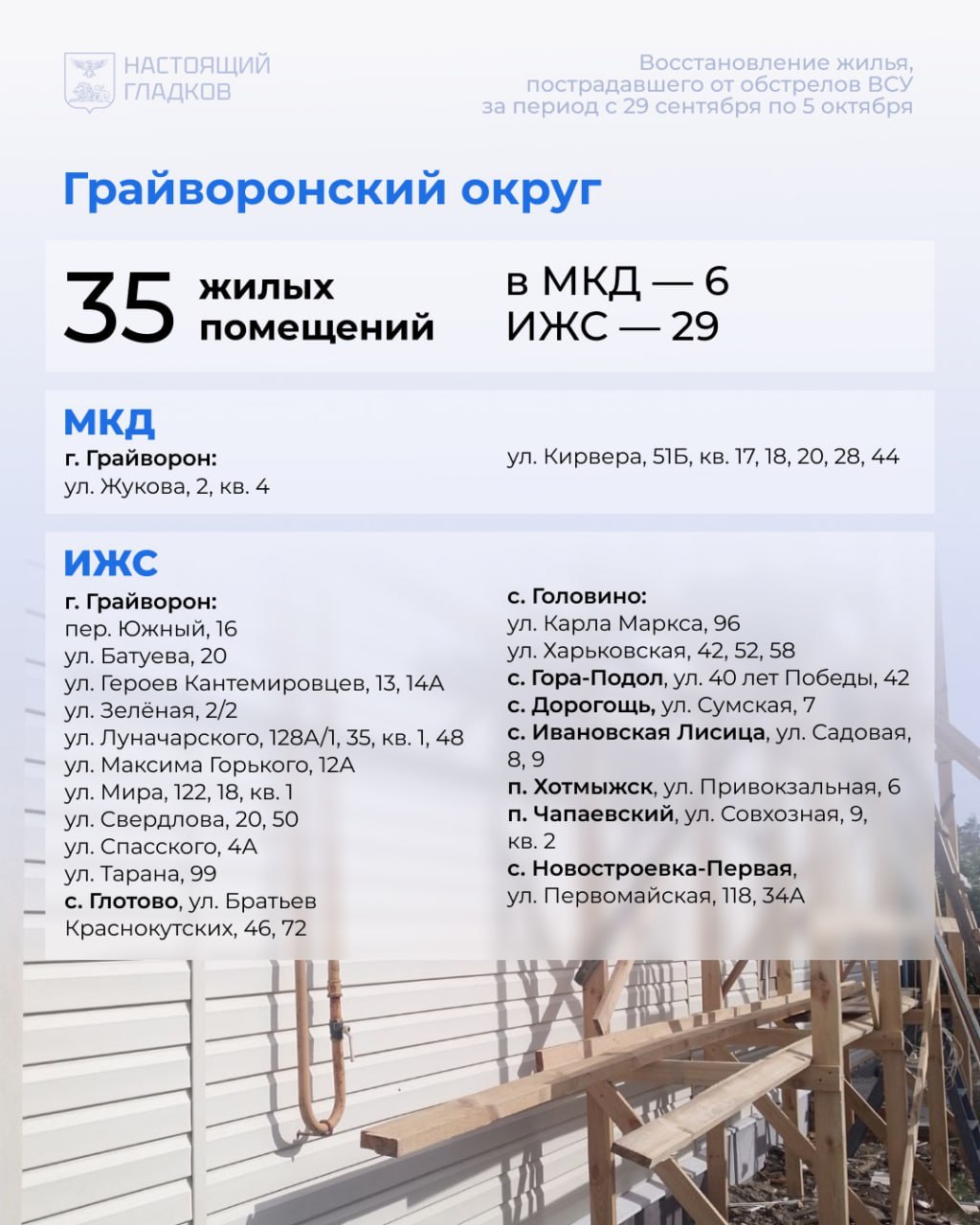 В Грайворонском округе восстановлено 35 домов и квартир. За неделю повреждения зафиксированы по 23 жилым помещениям и 8 машинам. Оплачена компенсация по 25 автомобилям.