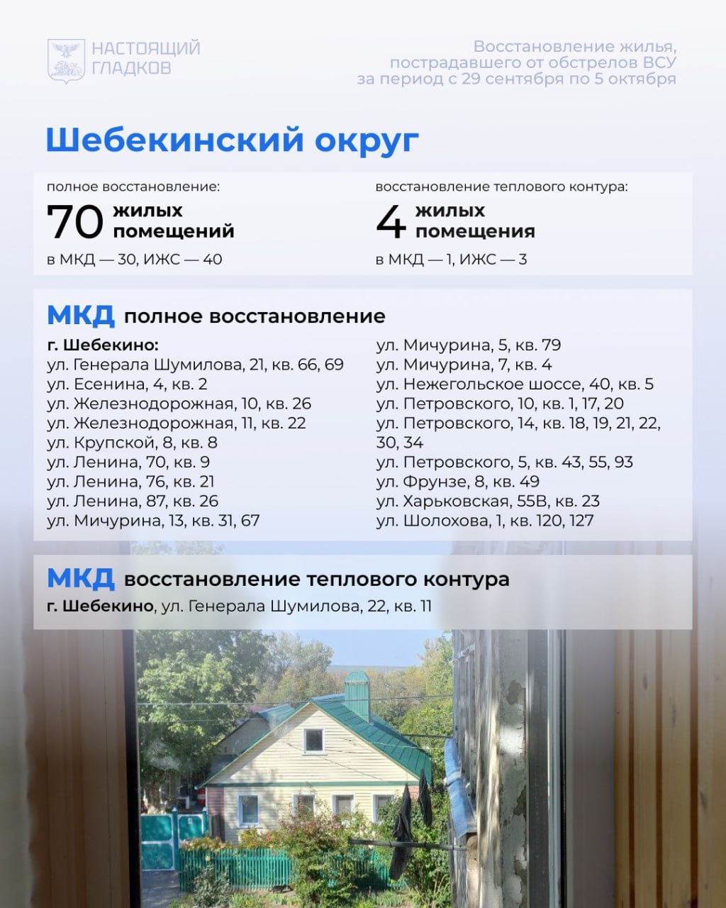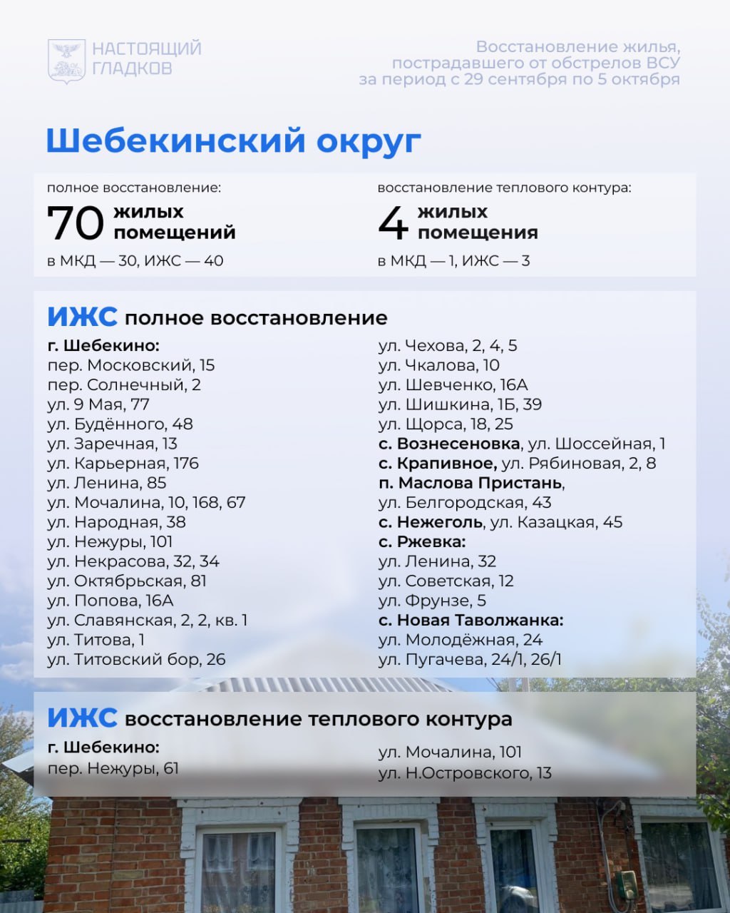 В Шебекинском округе завершили 70 объектов, закрыли контур на 4. За неделю выявлены 25 повреждённых домов и квартир, 23 машины. Перечислены компенсации по 29 автомобилям.
