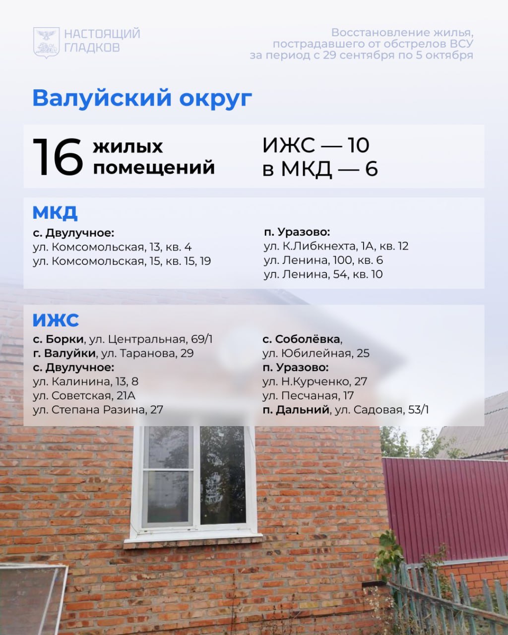 В Валуйском округе закончены 16 частных домов и квартир, повреждены — 12. Выплачена компенсация по 10 автомобилям.
