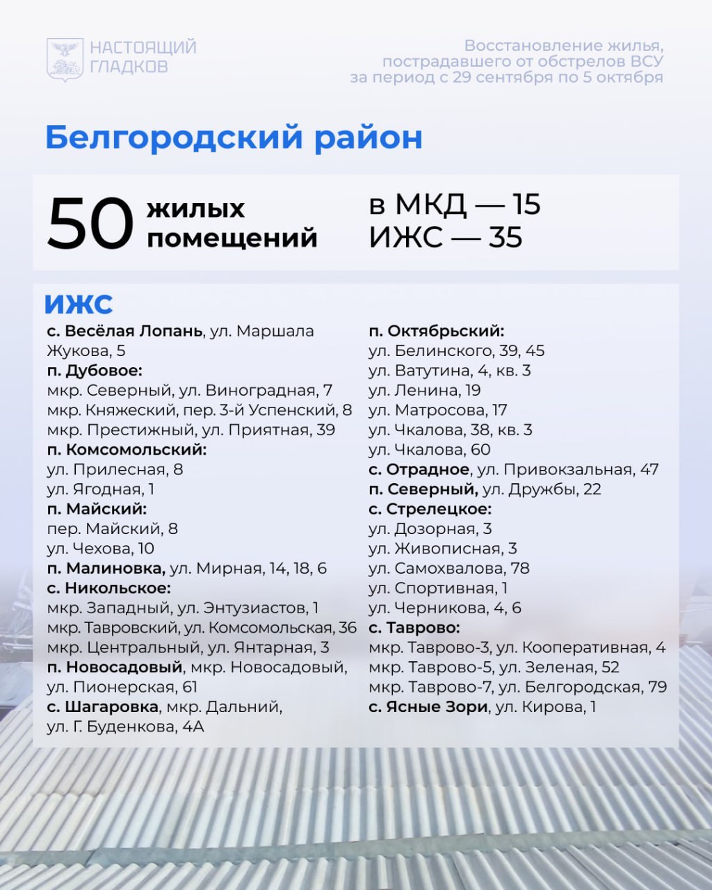 По Белгородскому району за неделю полностью восстановлено 50 объектов. Прирост на 20 повреждённых жилых помещений и 25 автомобилей.