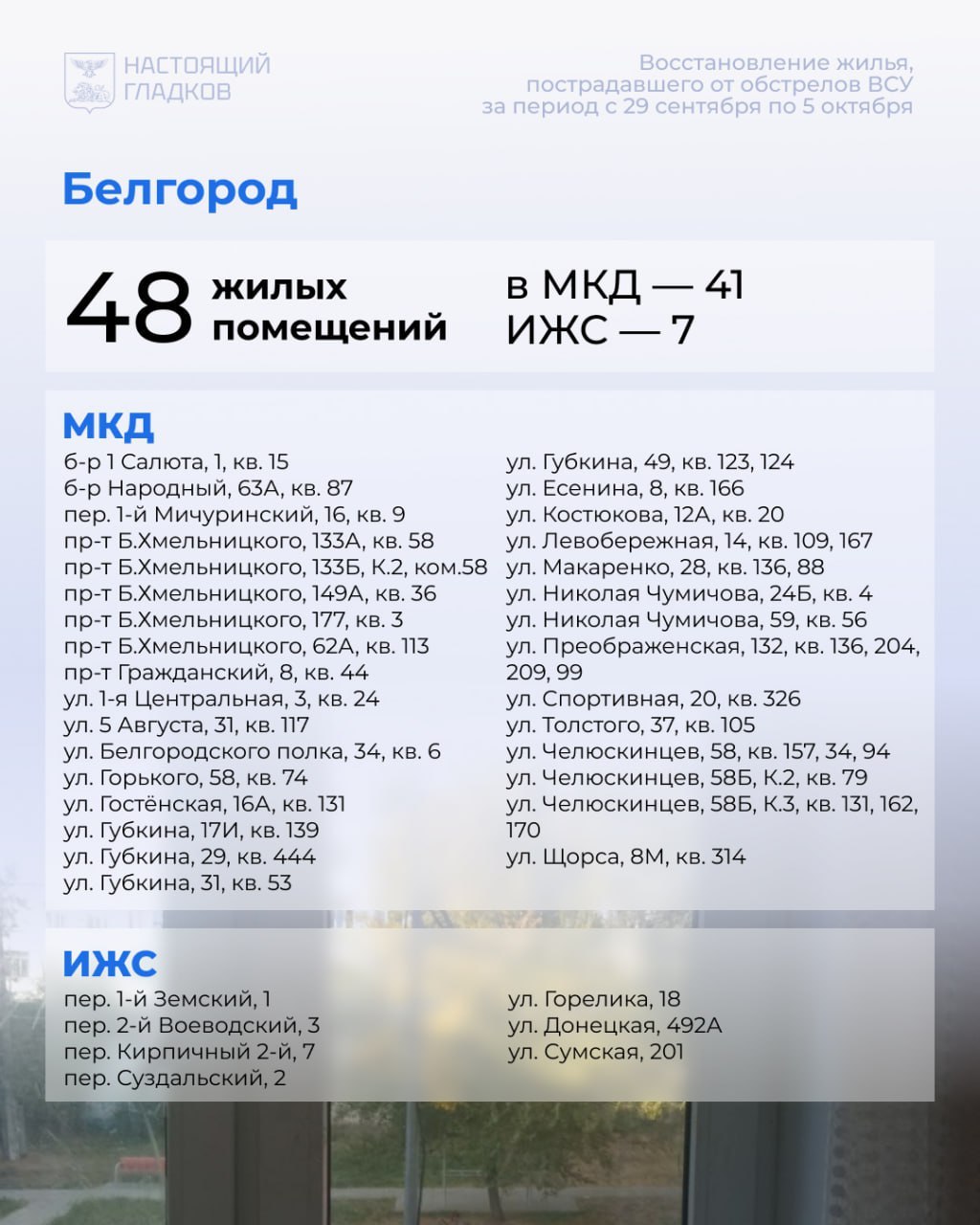 В Белгороде за прошлую неделю завершили 48 объектов. За этот же период повреждения выявлены в 32 жилых помещениях, а также по 6 машинам. В работе остаётся 301 объект.