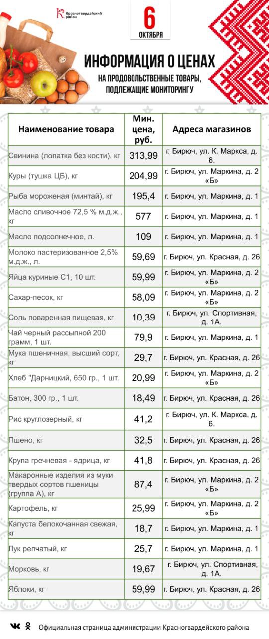 Представляю информацию о минимальных ценах на социально значимые товары по состоянию на 6 октября.