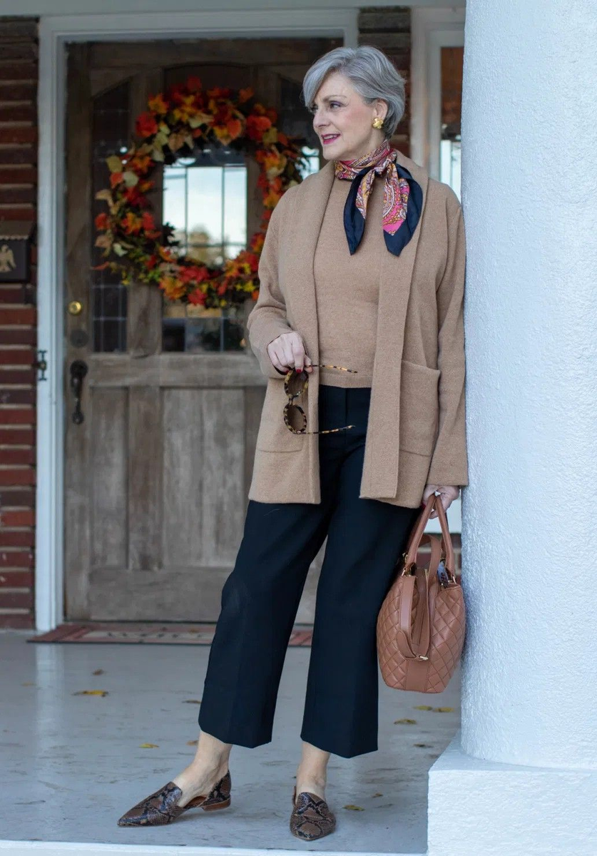 - Классика с акцентом: Прямые черные брюки отлично сочетаются с базовым темным свитером и ярким жакетом. Дополнения в виде шелкового платка на шее и туфель с открытой пяткой добавят элегантности. Завершите образ стильными темными очками и эффектной сумкой с ручкой-цепочкой.