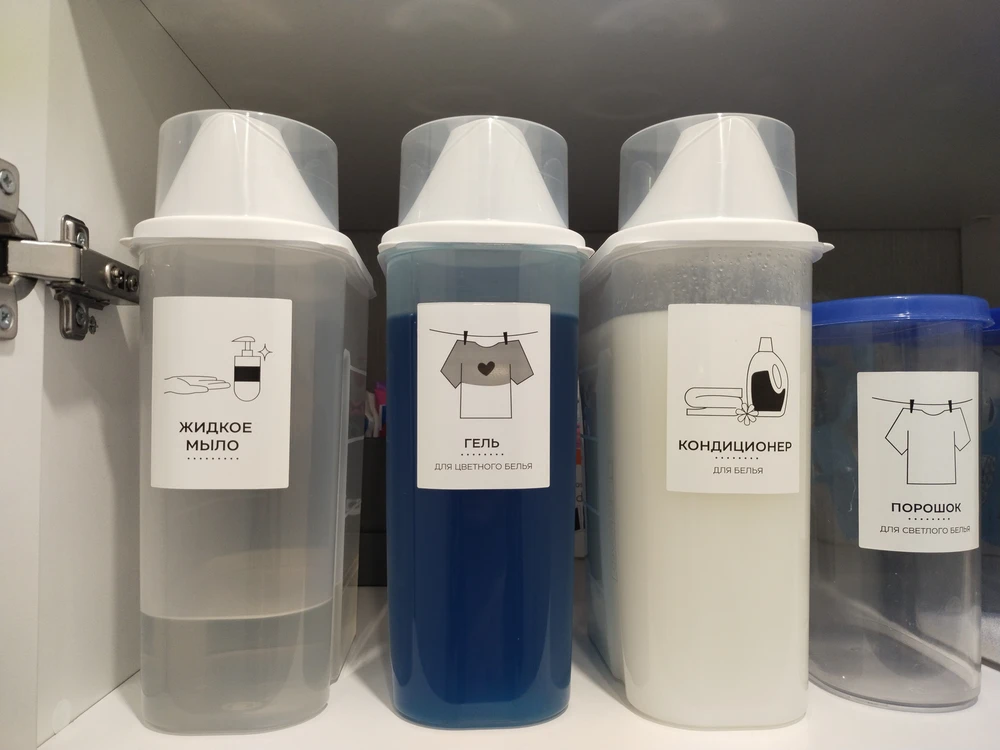 На первом месте – контейнеры для жидких средств, таких как гели и мыло. Теперь не нужно распахивать запечатанные канистры, чтобы налить нужное количество. Эти контейнеры с наклейками могут не только сэкономить пространство, но и украсить кухонный уголок. Например, набор из трёх контейнеров объемом 2200 мл стоит 557 рублей и идеально подходит для хранения гелей для стирки или моющих средств.