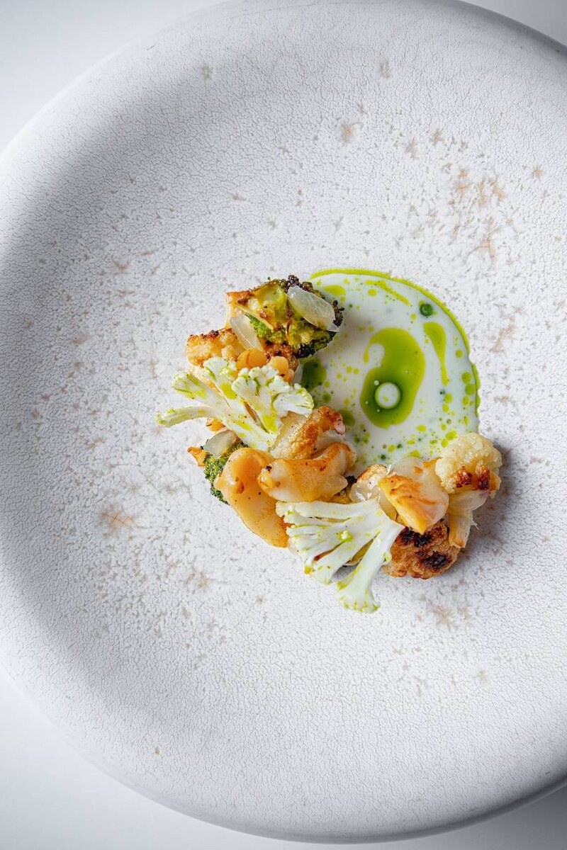 Композиция достигает своей вершины благодаря соусу на основе копчёного сулугуни, который добавляет кремовую насыщенность, а маринованный виноград вносит яркие и сладкие акценты. Масло петрушки дополняет гастрономическую симфонию, подчеркивая свежесть и яркость всех ингредиентов.