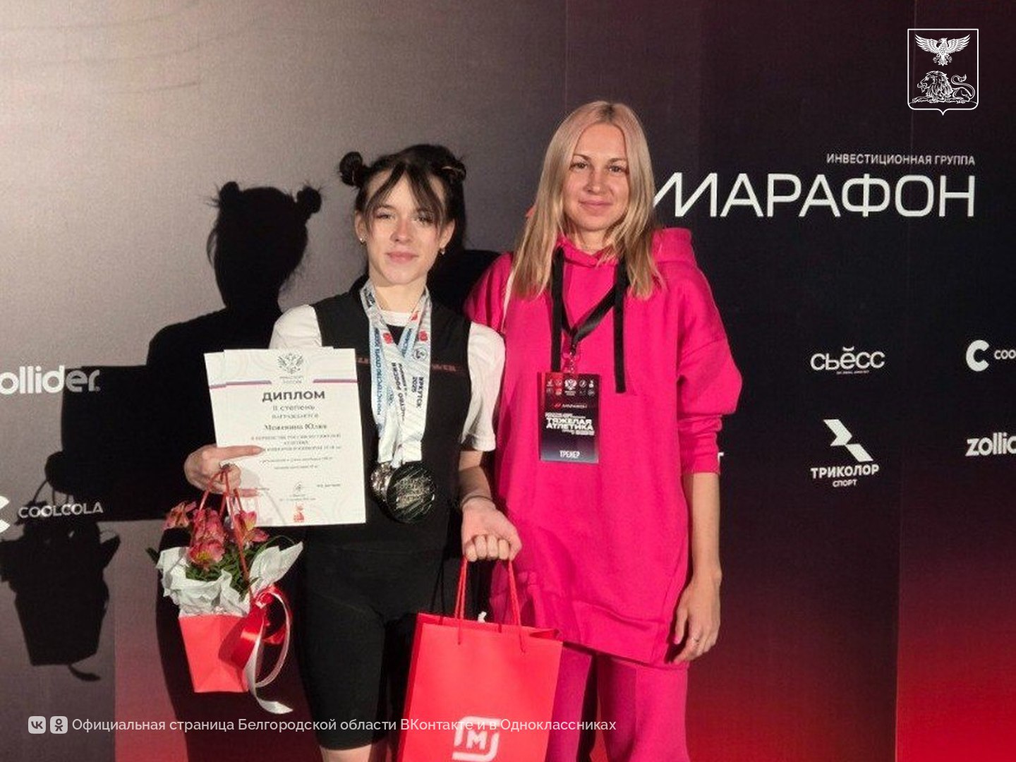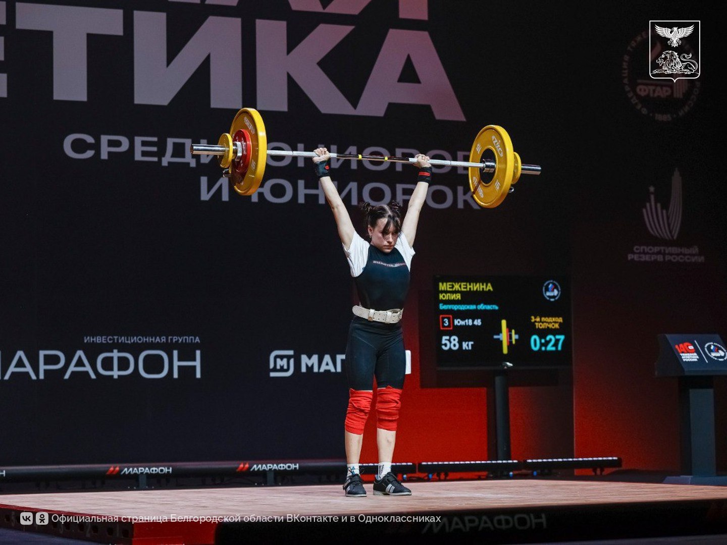 Воспитанница спортивной школы олимпийского резерва № 3 г. Белгорода Юлия Меженина показала отличный результат, завоевав сразу две серебряные награды: рывке с результатом 50 кг и в сумме двоеборья – 108 кг.