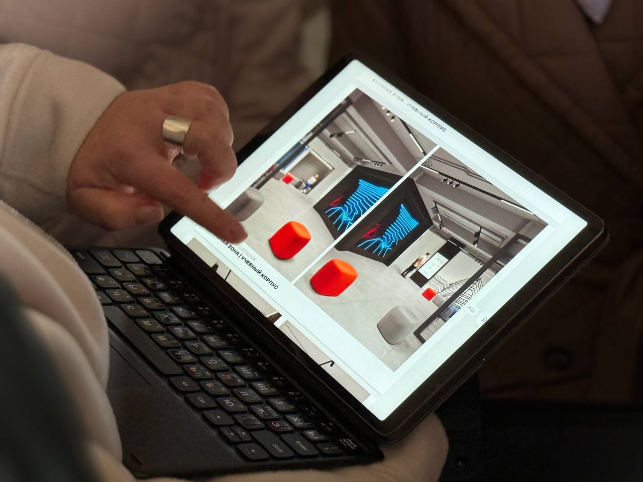 Дискутировали по выбору материалов для пола, стен и конструкции потолков. Рассматриваем смелую и современную идею с открытыми потолками, где элементы коммуникаций становятся частью дизайна. Это визуально расширяет пространство и добавляет ему индустриального стиля, перекликаясь со спецификой колледжа.