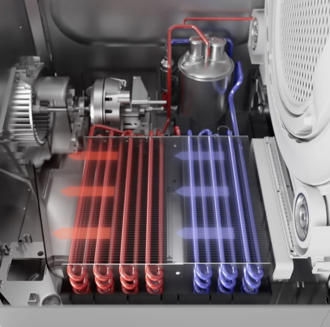 Конденсационные сушильные машины работают по принципу конденсации влаги. Влажный воздух из барабана проходит через теплообменник, где охлаждается, и влага собирается в специальный резервуар. После чего воздух снова нагревается и возвращается в барабан, создавая замкнутый цикл. Эти устройства не нуждаются в подключении к вентиляции, что делает их универсальными и менее зависимыми от внешних условий, таких как уровень влажности в помещении.