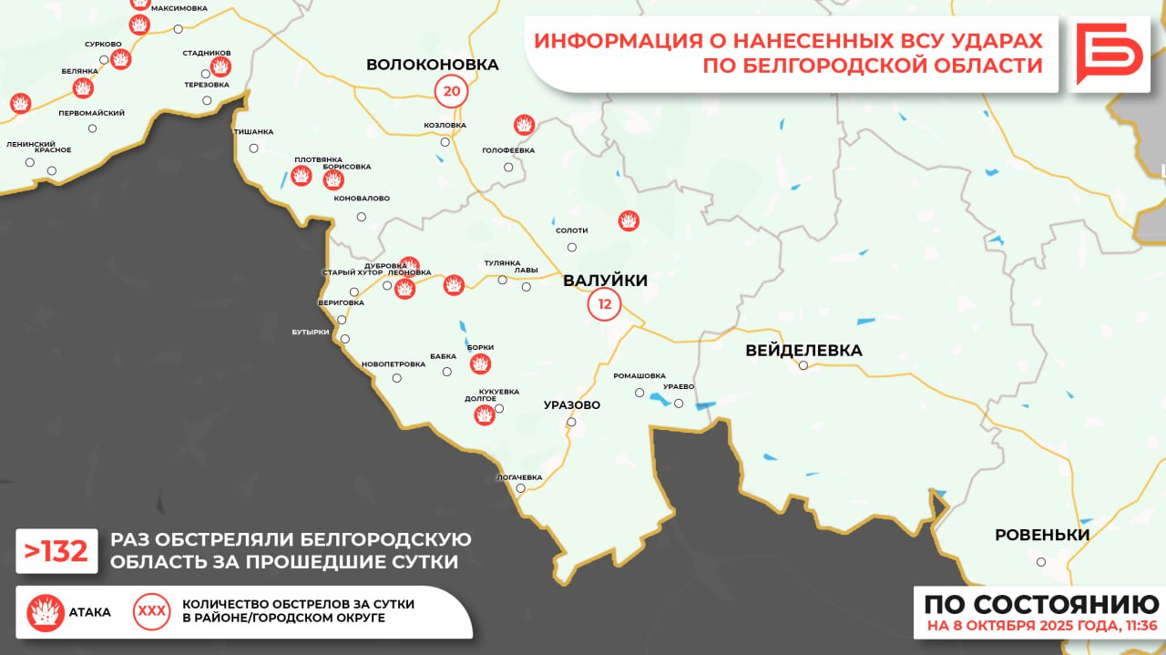 За прошедшие сутки ВСУ обстреляли Белгородскую область не менее 132 раз