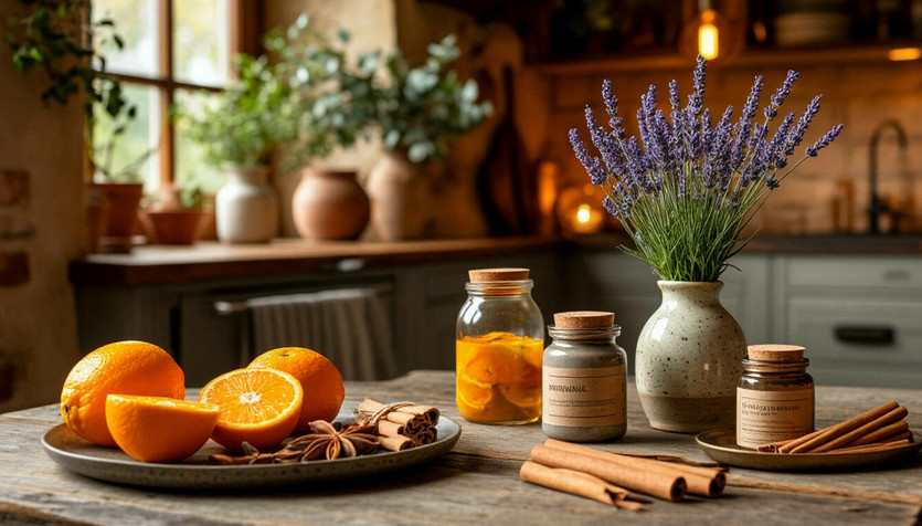 - Кухня: В кухне необходимо выбирать свежие и бодрящие ноты, такие как лимон, мята и розмарин, которые помогут нейтрализовать запахи готовки. Несколько капель эфирного масла в диффузоре или вазе с водой, украшенной дольками цитрусовых, сделают атмосферу более приятной.