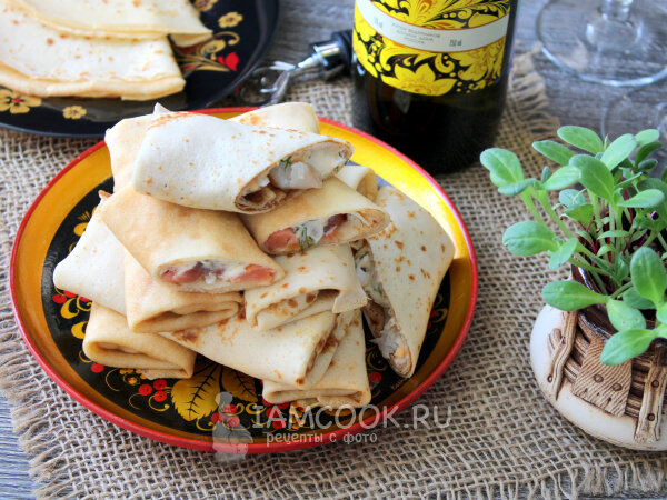 Готовые блинчики можно подавать как в свернутом виде, так и нарезанными по диагонали, что придаст им особый шарм. Эти вкусные закуски займут своё почётное место на любом застолье, радовать своим вкусом и оригинальным подходом.