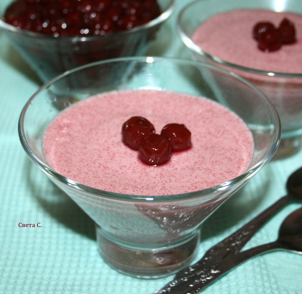 После застывания десерта его можно украсить по желанию. К примеру, свежими вишнями из варенья. Однако эта рецептура может варьироваться: вместо вишневого сиропа можно использовать любой сладкий сок. Так, при замене на яблочный сок получится замечательный яблочный мусс, а для создания клюквенного варианта понадобятся свежие ягоды, из которых следует отжать сок и добавить немного сахара. Идеальный десерт для любого повода!