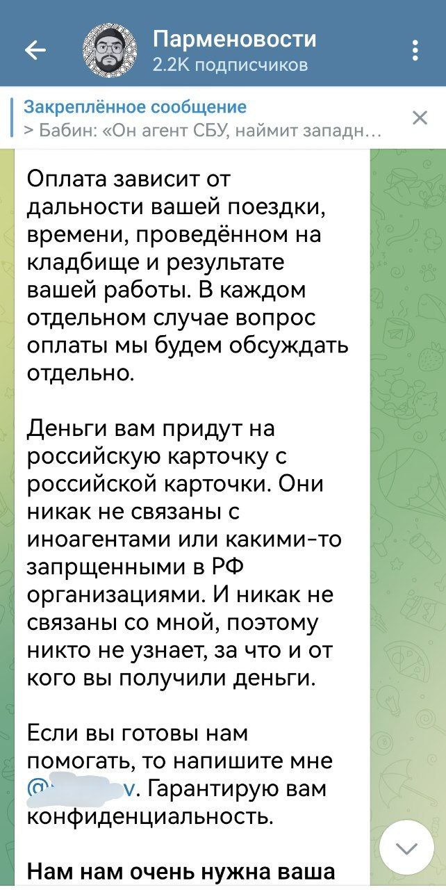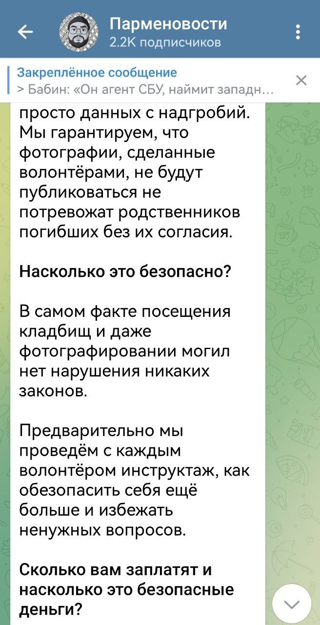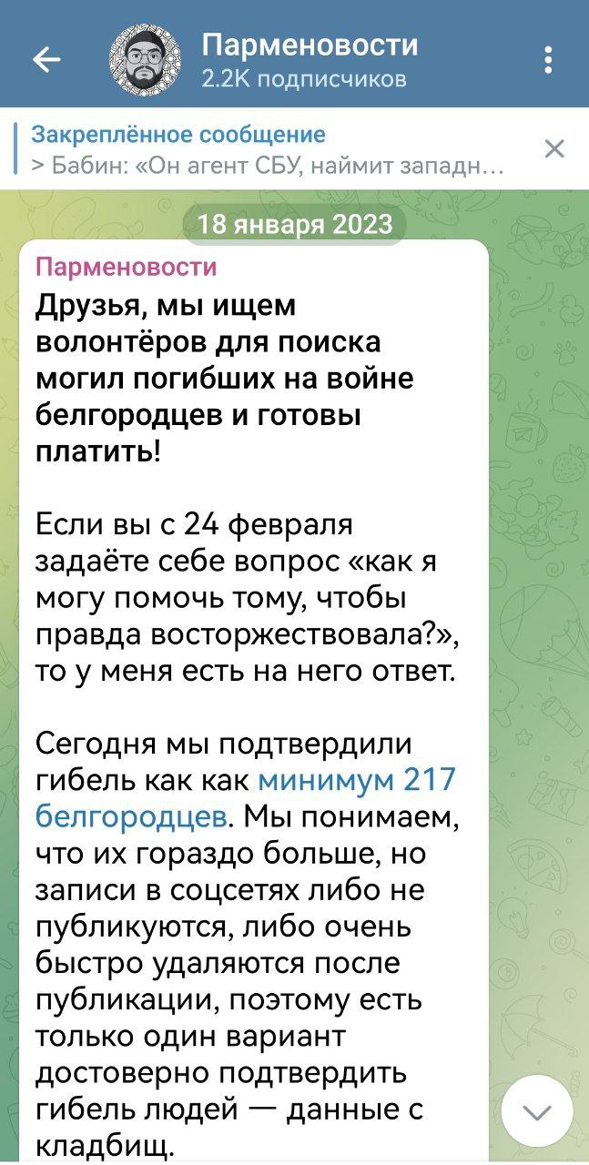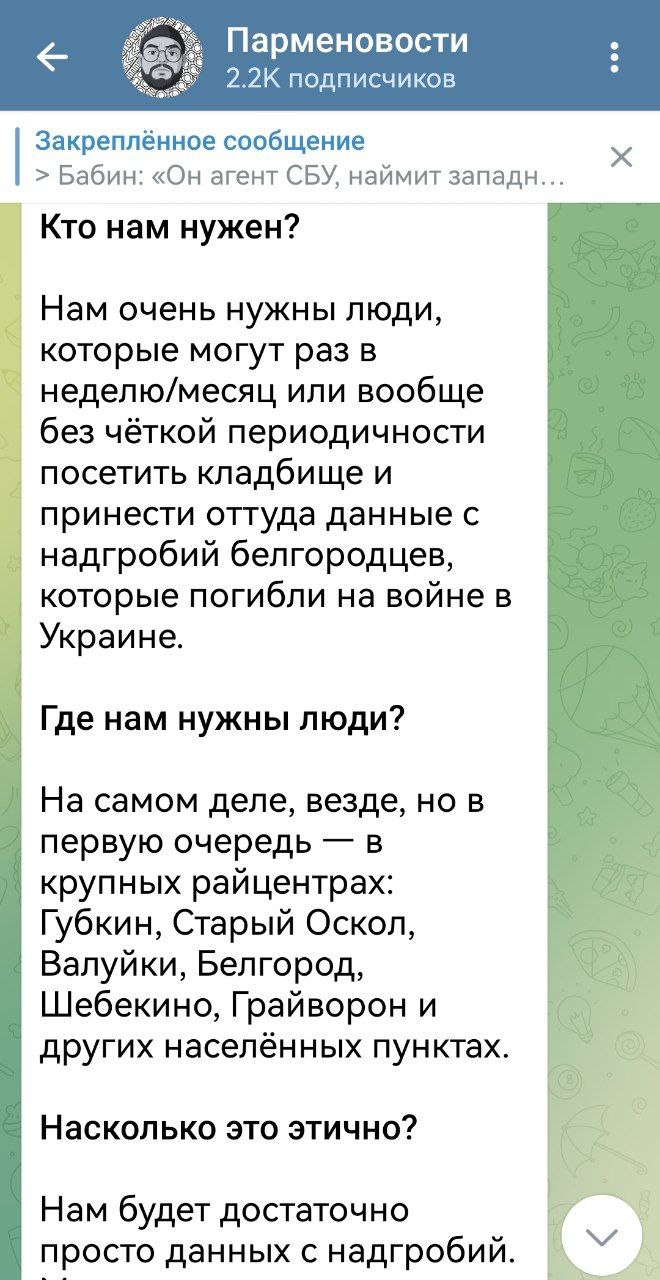 Это личный канал главного редактора "Пепел Белгород", иностранного агента и экстремиста Никиты Парменова, который после начала СВО бежал в Грузию. Там он был завербован украинскими спецслужбами и под их кураторством начал работать в интересах украинского ЦИПСО, которое стало выделять на его деятельность средства. Эти средства также шли на создание агентуры в Белгородской области. В январе 2023 года Парменов начал вербовку агентов под видом поиска волонтёров, которые должны были искать информацию о погибших бойцах ВС РФ. За данную работу Парменов предлагал "волонтёрам" деньги. Откуда у беглого релоканта, бывшего преподавателя университета, не имевшего никаких ресурсов, бизнеса и других источников доходов, средства на оплату многочисленной армии "волонтёров" — догадайтесь сами.