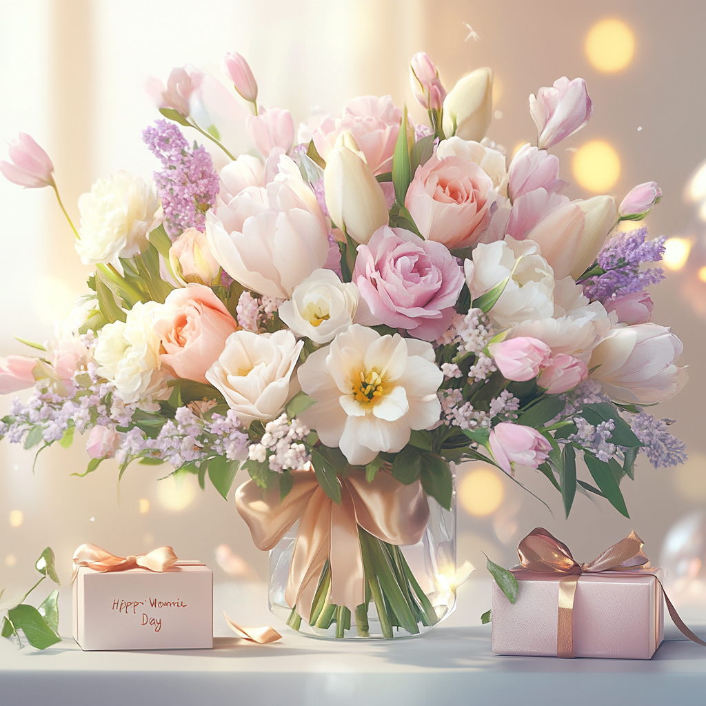 - Вид цветов: Розы пастельных тонов, пионы и альстромерии — идеальный выбор для мамы. Для подруги можно выбрать ранункулюсы, фрезии или тюльпаны. Коллегам подойдут герберы и хризантемы, а для свекрови отличным вариантом будут орхидеи или каллы.