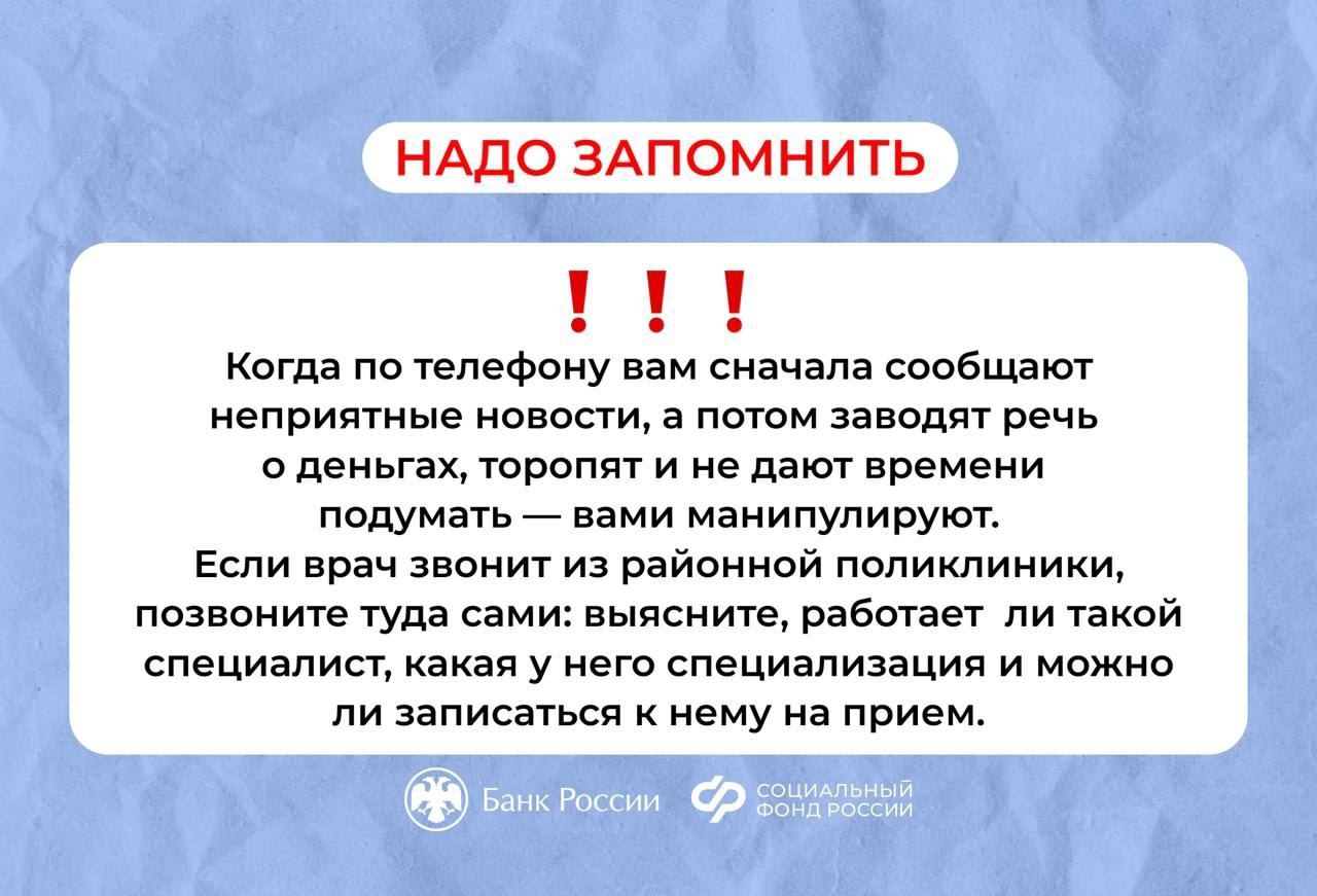 Не верьте таким звонкам! Любая информация, полученная по телефону, особенно если она вызывает беспокойство, требует проверки. Перепроверяйте информацию! Найдите официальный телефон вашей поликлиники и свяжитесь с ними напрямую.