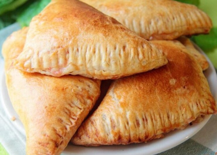 Сверху выкладывают начинку из колбасы и сыра, после чего соединяют края теста, придавая ему форму треугольника, и тщательно скрепляют edges вилкой.