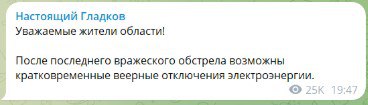 Глава региона Гладков сообщил, что система ПВО сбила украинские ракеты над Белгородом и Белгородским районом. Пострадавших нет, но возможны кратковременные веерные отключения электроэнергии.В результате падения осколков зафиксировано...