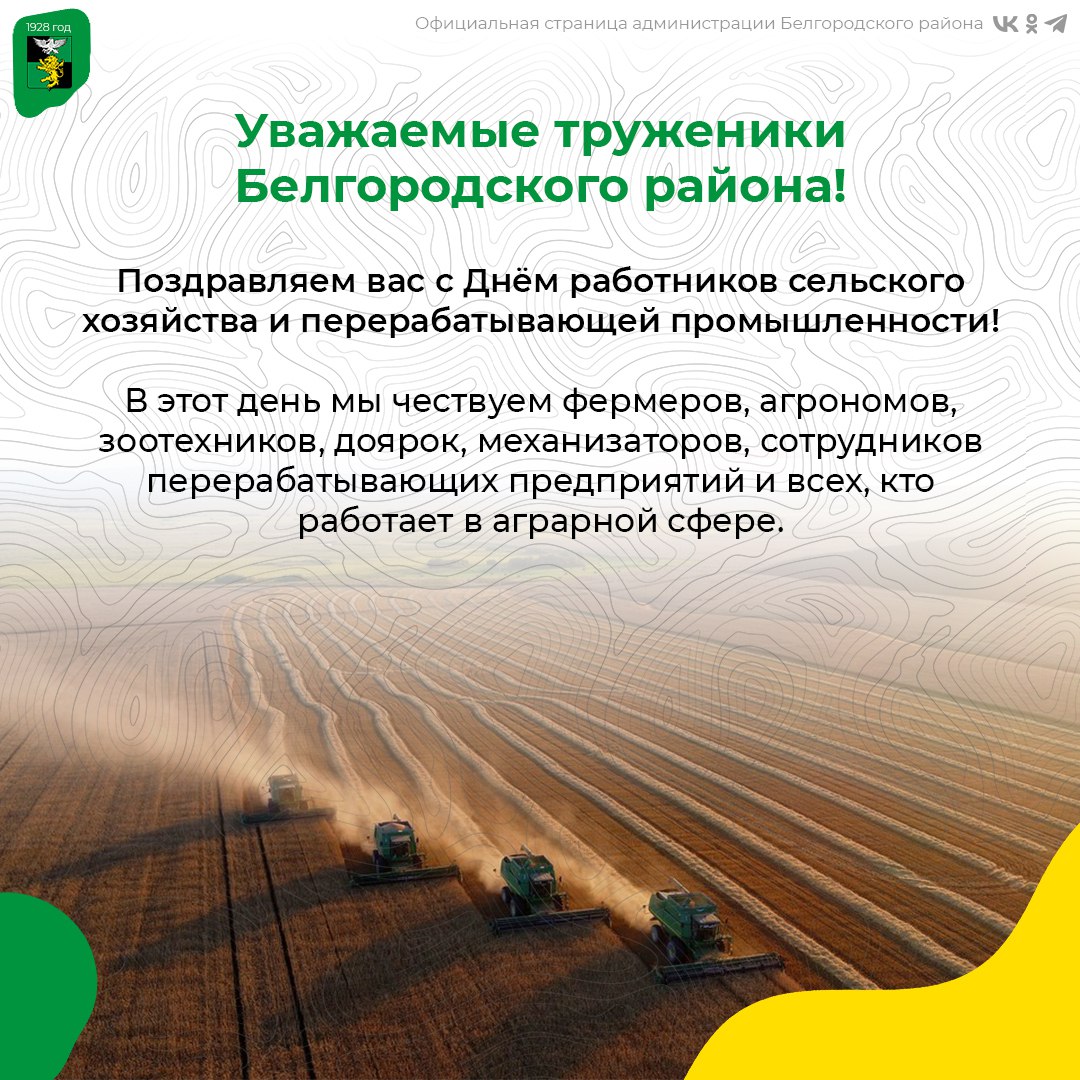 Уважаемые труженики Белгородского района! Поздравляем вас с Днём работников сельского хозяйства и перерабатывающей промышленности!
