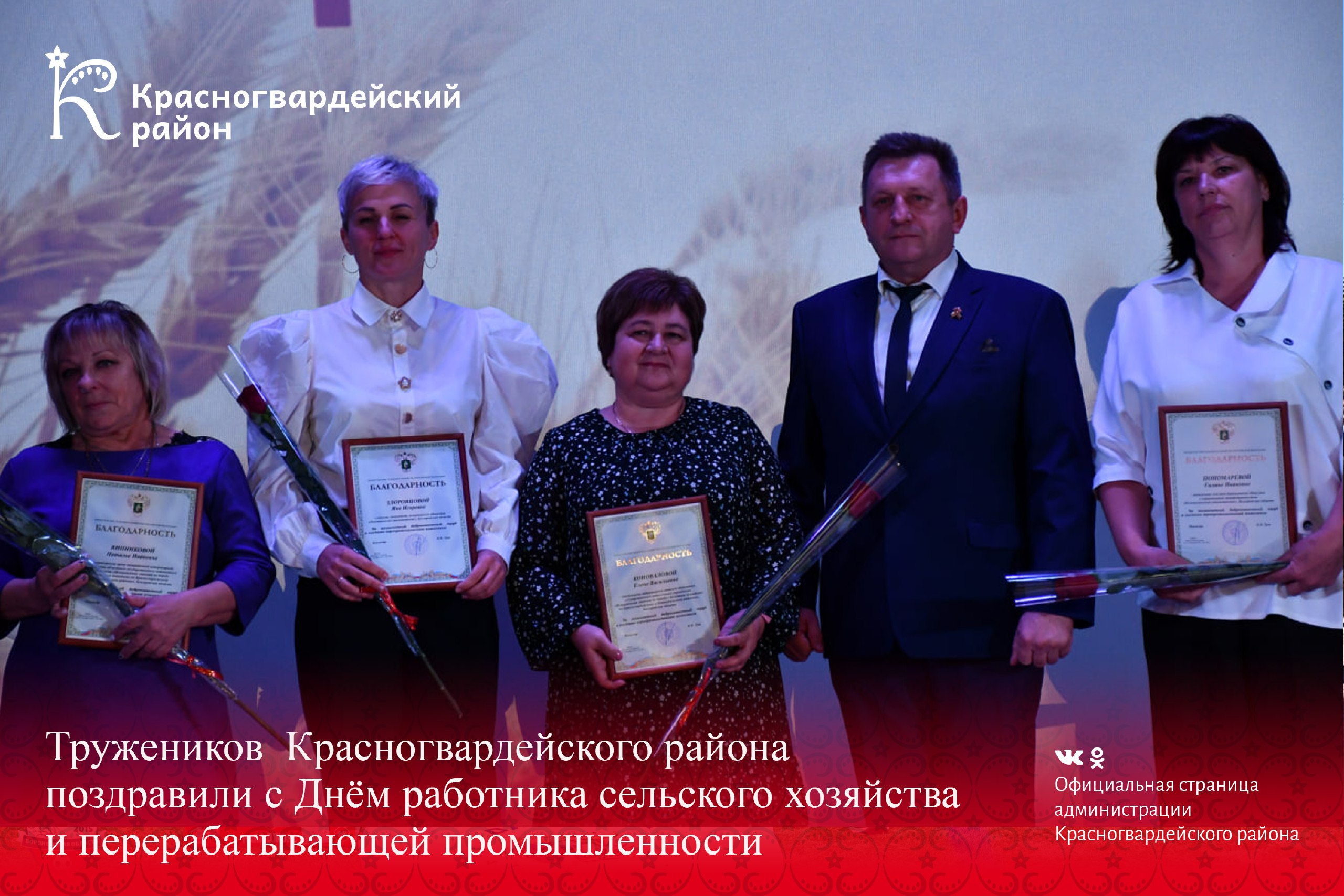Три представителя сельскохозяйственной отрасли Красногвардейского района были отмечены наградами различного уровня на региональном мероприятии в честь праздника. Так, водитель автомобиля СПК «Большевик» Сергей Ерёмин награждён Благодарственным письмом Губернатора Белгородской области. Главный экономист АПК «Бирюченский» Раиса Лопатина и оператор свиноводческих комплексов участка осеменения и ожидания АО «Никитовский свинокомплекс» Мария Ханина удостоены Благодарности Министерства сельского хозяйства Российской Федерации.