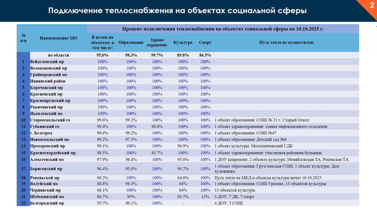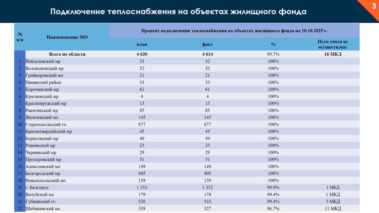Тепло уже подано в 99,7% многоквартирных домов. Пока в регионе без теплоснабжения остаются 16 МКД, сообщил замгубернатора Сергей Довгалюк. 11 из них – в Шебекинском округе, три дома – в Губкинском и по одному в Белгороде и Валуйках.