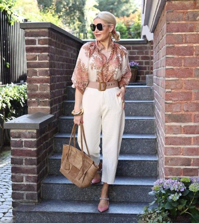 - Пудровые оттенки: Блузка пудрового цвета с рубашечным воротником и рукавами 3/4 освежает и придает молодёжный вид. Комбинируйте ее с темными брюками, например, черными прямыми моделями, для завершения элегантного образа.