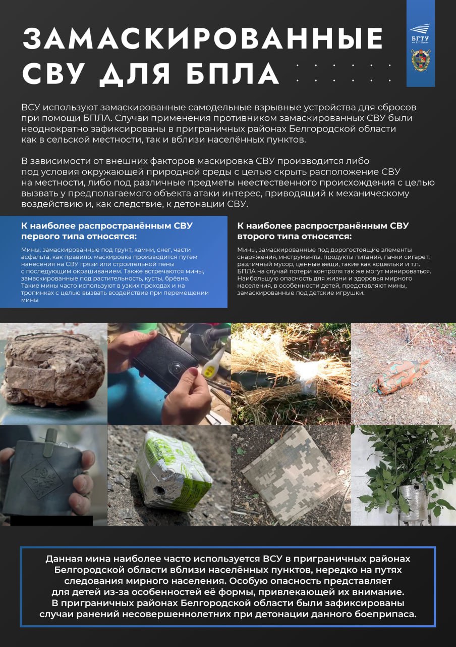 В приграничных районах Белгородской области необходимо быть предельно внимательными. ВСУ могут предпринимать следующие попытки минирования и применения взрывных устройств.