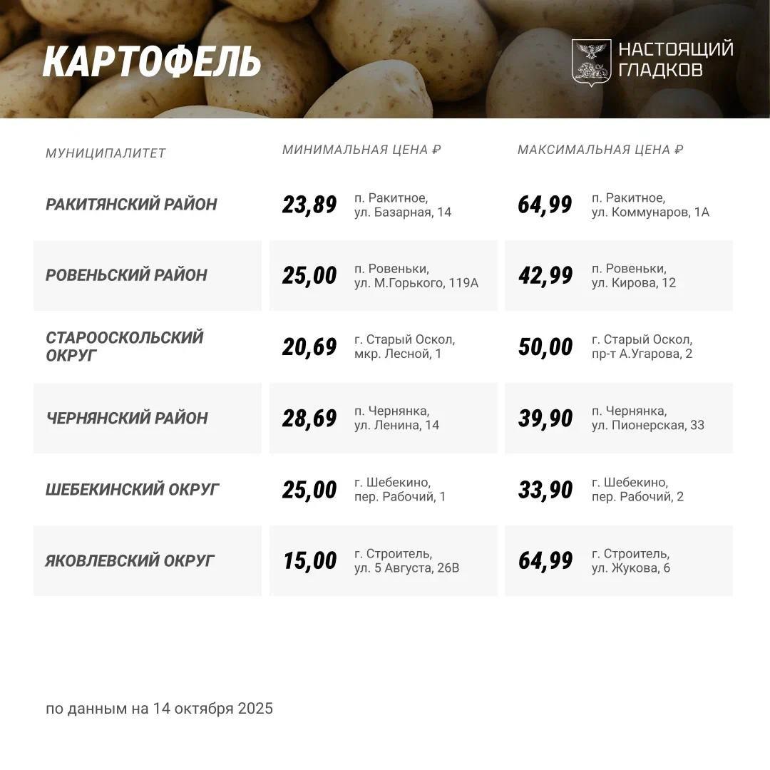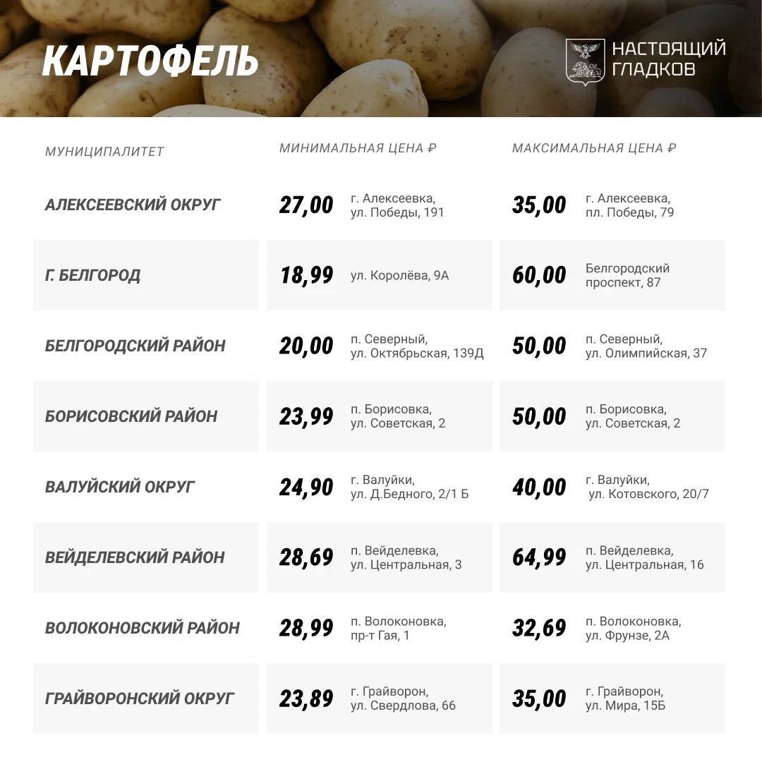 Самый дешевый картофель оказался в одной из торговых точек Строителя, самый дорогой – тоже в Строителе, но в другом магазине, а также в одной из торговых точек Ракитного. Причём разброс цен на «второй хлеб» – более, чем в четыре раза: с 15 до почти 65 рублей.